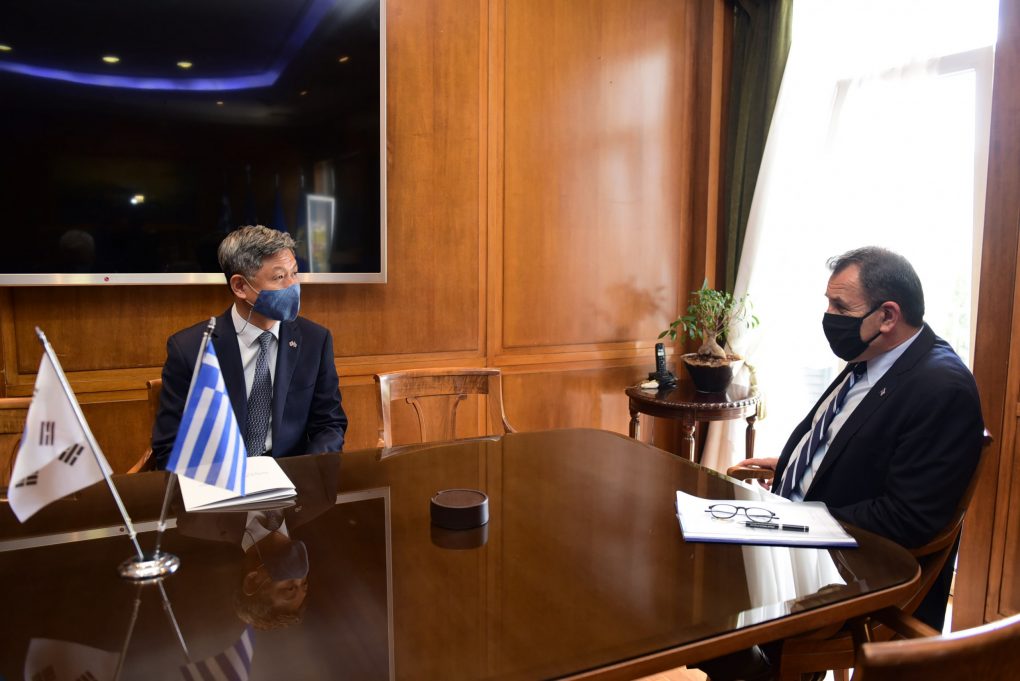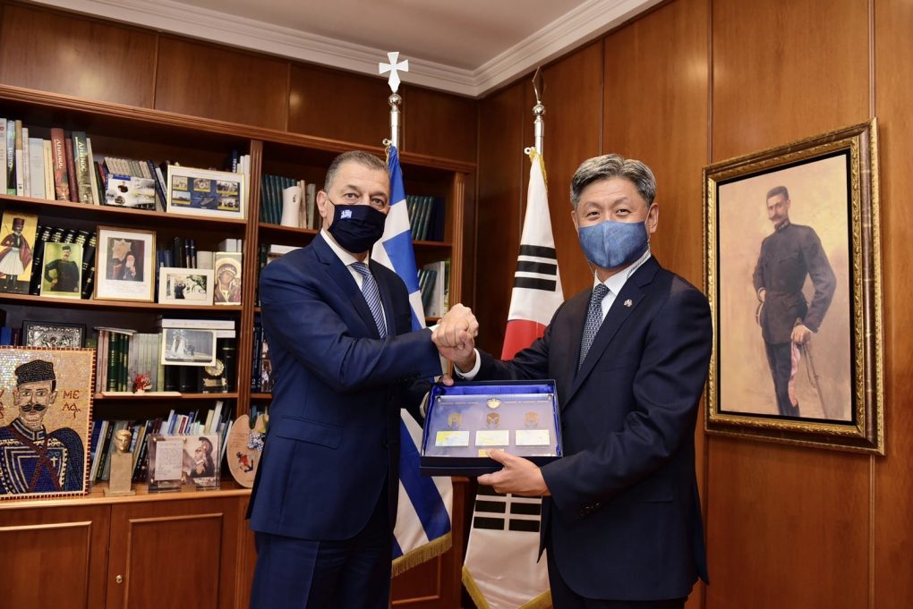 The Minister of National Defence Mr. Nikolaos Panagiotopoulos met today, Wednesday 2 June 2021, with the outgoing Ambassador of the Republic of Korea Mr. Soosuk Lim, with whom he discussed matters pertaining to the enhancement of bilateral defence cooperation.