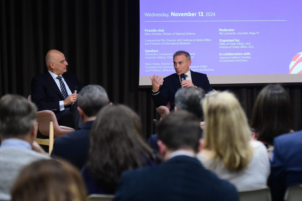 On Wednesday 13 November 2024, the Minister of National Defence Nikos Dendias attended the “Transatlantic shifts and regional stakes: A Post – US elections analysis”, which was organised by the American College of Greece and the Hellenic-American Chamber of Commerce. During the event, which was held in the facilities of the American College of Greece, Mr. Dendias discussed with the Professor of International Affairs and Director of the ACG Institute of Global Affairs, Konstantinos Filis.