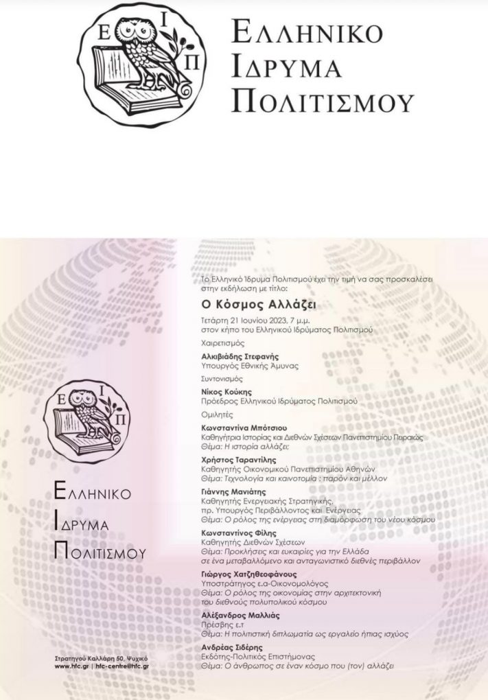 On Wednesday 21 June 2023, the Minister of National Defence, Mr. Alkiviadis Stefanis attended the event of the Hellenic Foundation for Culture under the title: “The World is changing” and made an address.