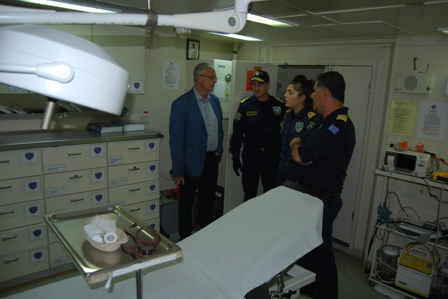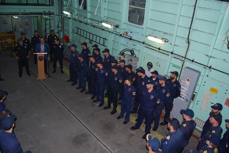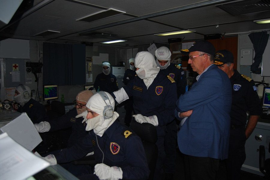 He addressed the captain and the crew of the ship and congratulated them on the flawless execution of the exercise and expressed his enthusiasm regarding the ship’s capabilities, and the Navy’s state of readiness and efficiency in general. He made a special reference to the personnel, who, under the difficult circumstances, resulting from the financial crisis, kept the ships both battle worthy and in a high state of readiness. At the same time, he assured that the maintenance and armaments programs will be continued –aiming to protect the society and out of respect to the Greek taxpayers – as well as that until the end of the year, the Armed Forces members will get the money owed to them. He also pointed out that the political leadership of the Ministry of National Defence really appreciates the role of the Armed Forces regarding the country’s security reinforcement, acknowledging that especially in this particular time period, no one dared to threat our country’s fair principles, because everybody knows that we possess a battle worthy force that will protect our land.