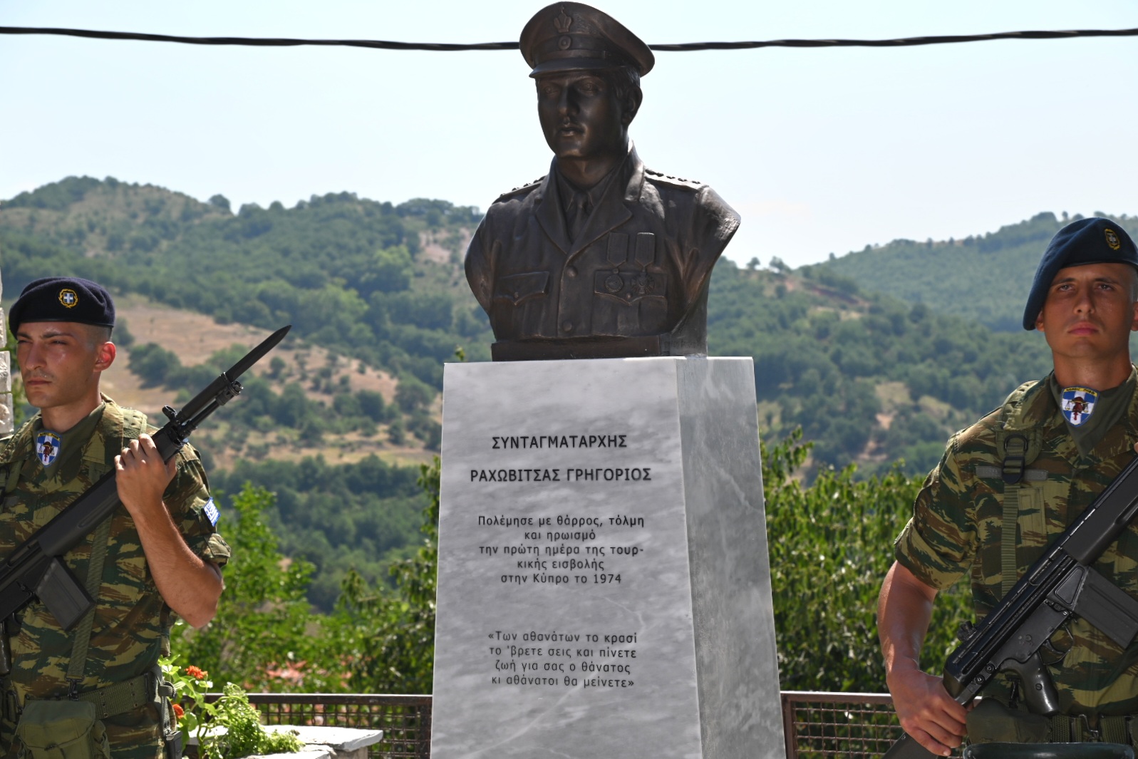 The Deputy Minister of National Defence Mr Nikolaos Chardalias conducts the unveiling of the bust of the Colonel (TECH) Grigorios Rachovitsas in Mouzaki Municipality, at the Local Community of Agios Akakios