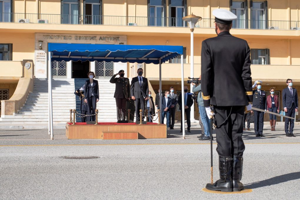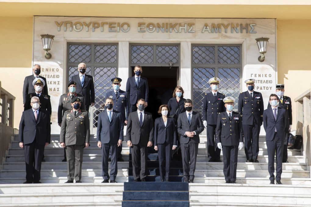 The welcoming was attended by the Deputy Minister of National Defence Mr. Alkiviadis Stefanis, the Secretary General of the Ministry Mr. Antonis Oikonomou, the Chief/HNDGS, General Konstantinos Floros, the Chief/HAFGS, Lieutenant General (HAF) Georgios Blioumis, the Chief/HAGS, Lieutenant General Charalampos Lalousis, and the Chief/HNGS Stylianos Petrakis (HN).