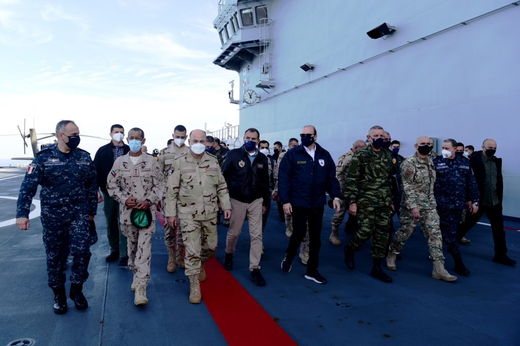 The Minister of National Defence, Mr. Nikolaos Panagiotopoulos, accompanied by HNDGS/Chief General Konstantinos Floros, attended the Distinguished Visitors Day (DV DAY) of the joint Greece-Egypt exercise “MEDOUSA 11”, with forces’ participation from Cyprus and the United Arab Emirates.
