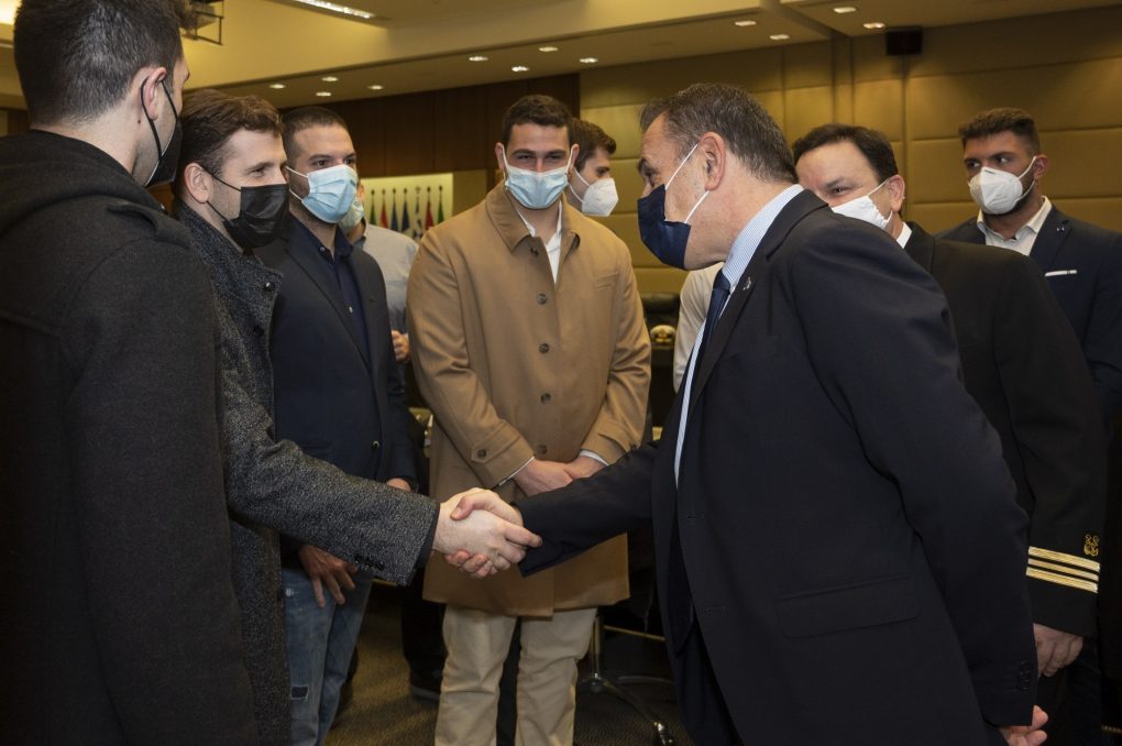 The Minister of National Defence Mr. Nikolas Panagiotopoulos honoured today, Tuesday 28 December 2021, at a special ceremony held in the “Ioannis Kapodistrias” Hall, the members of the National Water Polo Team, their coach Lieutenant (Hellenic Coast Guard) Mr. Thodoris Vlachos, and the President of the Hellenic Swimming Federation Mr. Kyriakos Giannopoulos, for acquiring the silver medal in the “Tokyo 2020” Olympics.