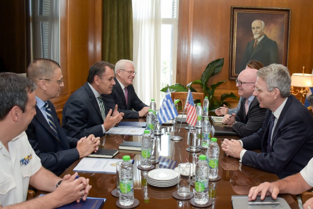 The Minister of National Defence Mr. Nikolaos Panagiotopoulos had a meeting, today, with the Acting Assistant Secretary of US Department of State Mr. Philip T. Reeker who was accompanied by the Ambassador of the USA to Athens Mr. Geoffrey R. Pyatt. They discussed the reinforcement of the bilateral cooperation in the context of the Strategic Dialogue and the developments in the Eastern Mediterranean.