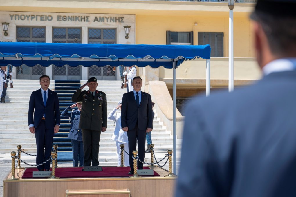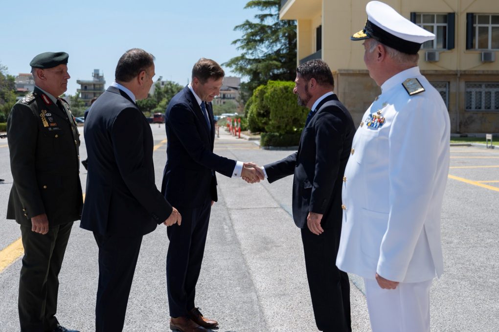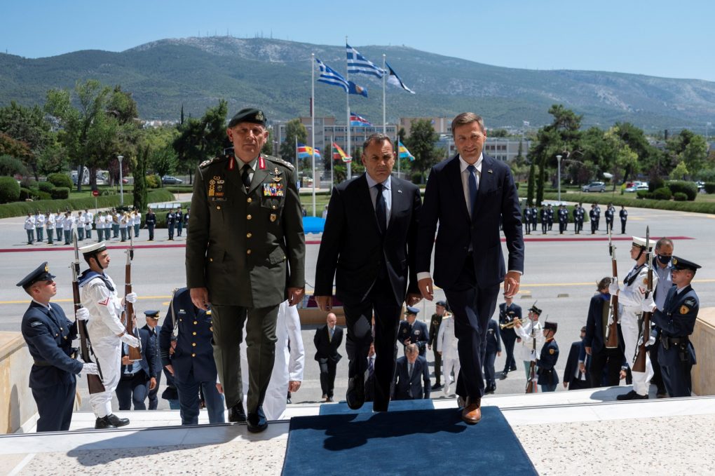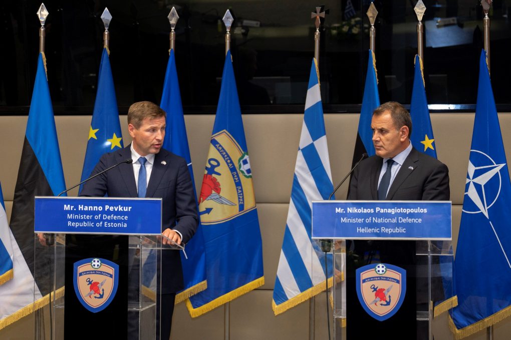 On Thursday, 04 August 2022, the Minister of National Defence Mr Nikolaos Panagiotopoulos had a meeting with the Defence Minister of Estonia Mr Hanno Pevkur, who is conducting an official visit to Greece. The meeting was attended by the Deputy Minister of National Defence Mr Nikolaos Chardalias, HNDGS/Chief General Konstantinos Floros, HNGS/Chief Vice Admiral Stylianos Petrakis HN, HAFGS/Chief Lieutenant General Themistoklis Bourolias and HAGS/Deputy Chief Lieutenant General Georgios Kellis, substituting HAGS/Chief.