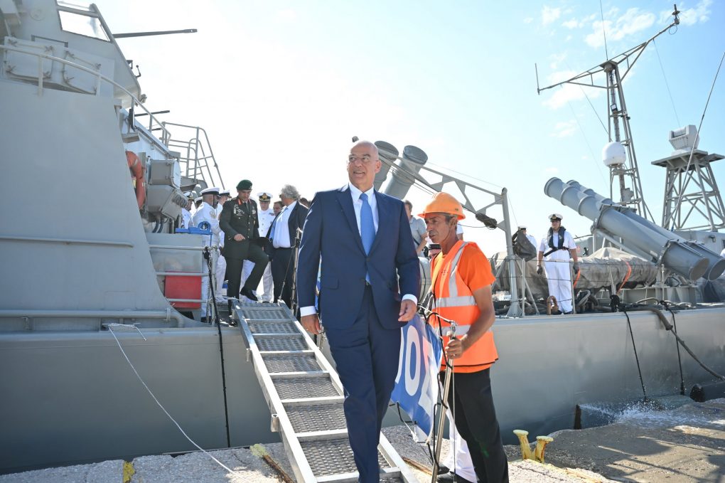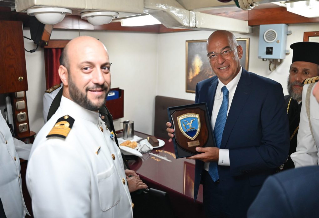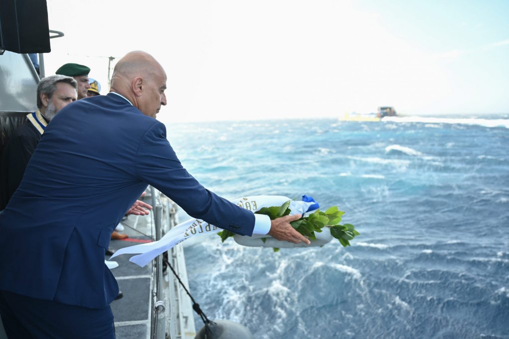 Mr. Dendias, accompanied by the Chief/HNDGS General Dimitrios Choupis and the Chief/HNGS Vice Admiral Dimitrios-Eleftherios Kataras HN, boarded on the Guided Missile Fast Patrol Vessel “MYKONIOS” of the Navy, which sailed in the region where “ELLI” cruiser was sunk. The memorial service for the fallen and the wreath throwing by the Minister of National Defence and Chief/HNDGS followed. The Frigate “AIGAION” honorarily anchors at the spot where the Guided Missile Fast Patrol Vessel “MYKONIOS” sailed.