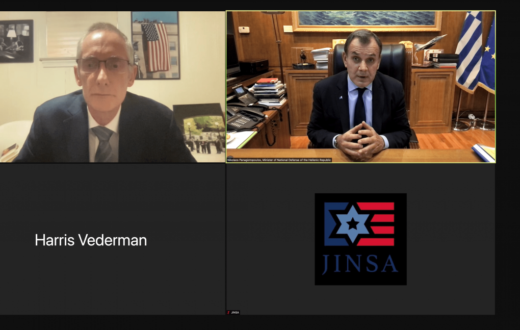 The Minister of National Defence Mr. Nikolaos Panagiotopoulos participated today, Thursday 11 November, at a webinar of the American- Jewish organisation JINSA, coordinated by Mr. John Hannah, former National Security Advisor to U.S. Vice President Dick Cheney.