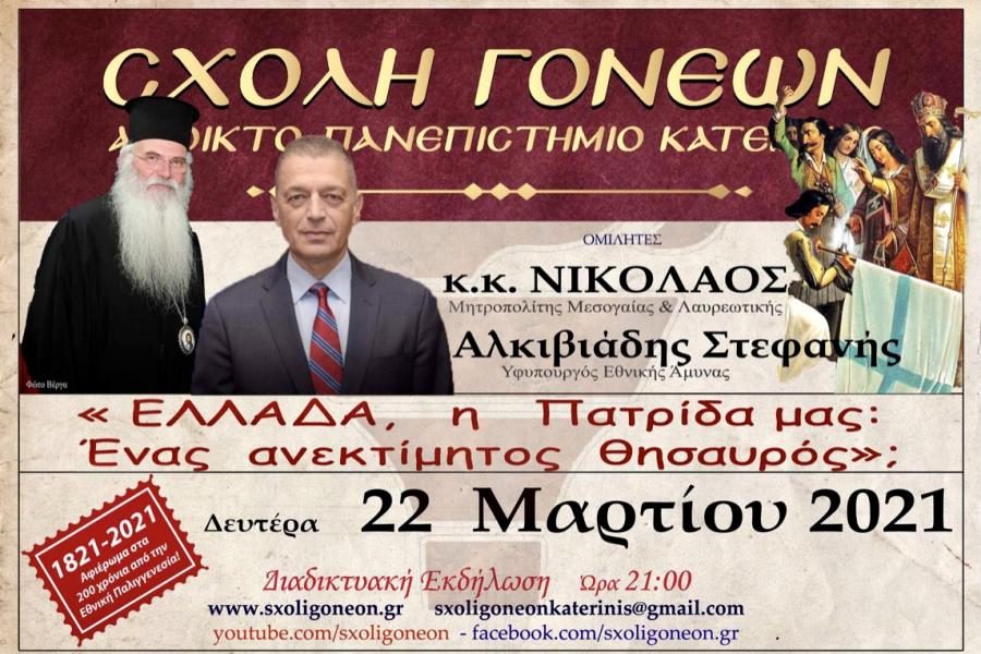 The Deputy Minister of National Defence ALKIVIADIS STEFANIS, delivered a speech, on Monday 22 March 2021, at the School for Parents – Open University of Katerini, in the context of an event on the subject “Greece, our Homeland: A priceless treasure”, dedicated to the 200th anniversary of National Rebirth.