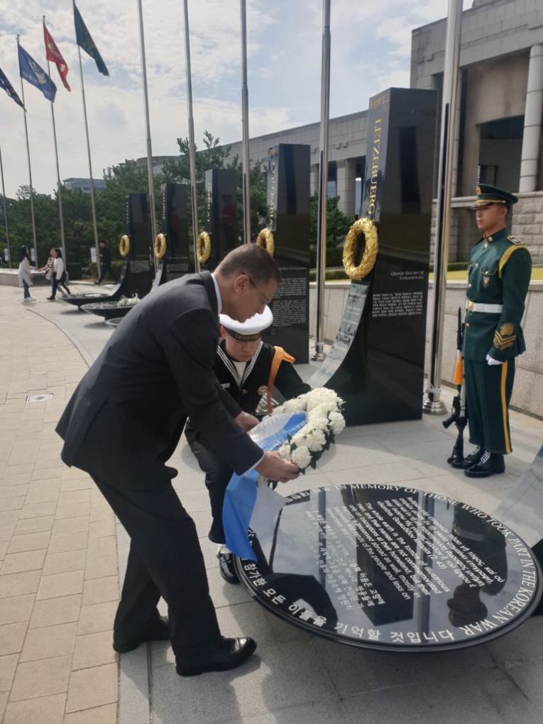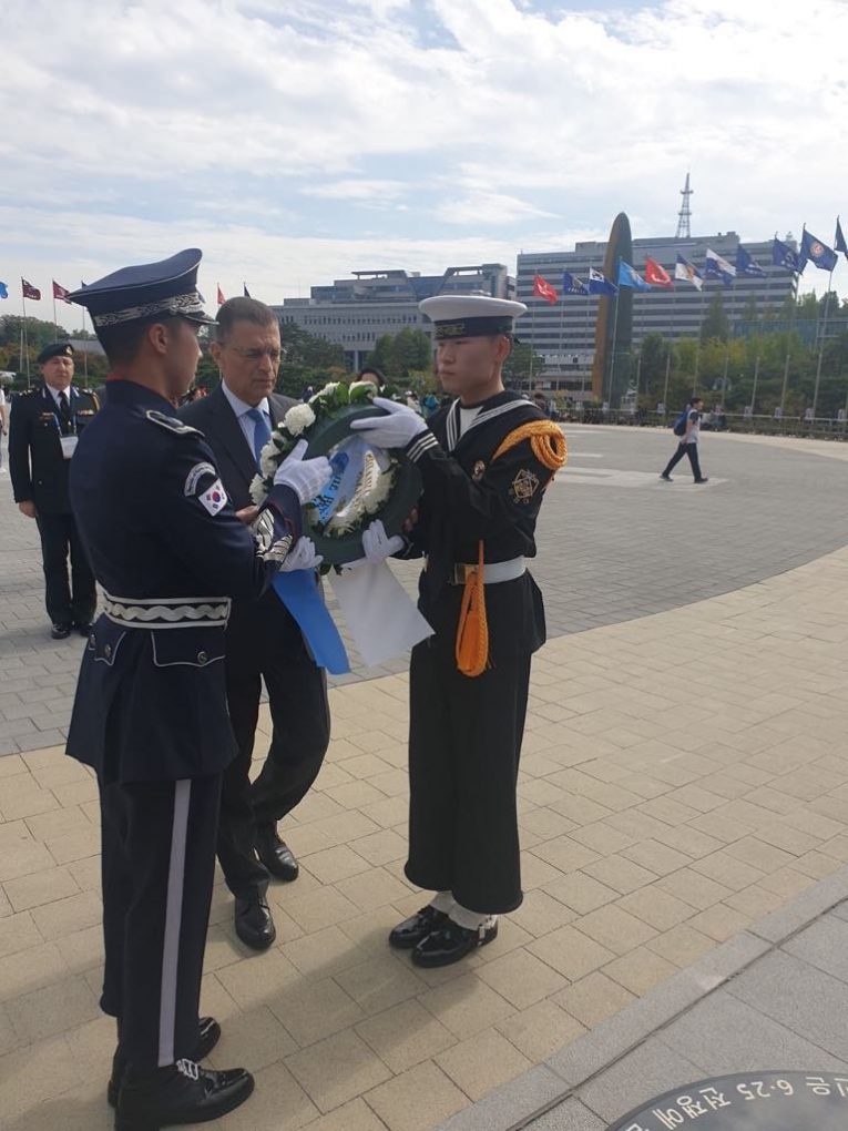 Finally, the Deputy Minister of National Defence visited the Monument which is dedicated to the Greek Expeditionary Force, the Orthodox Metropolis of Korea, where he had an official meeting with His Beatitude the Metropolitan Bishop of Korea Ambrosios, as well as the War Memorial of Korea, where he laid a wreath at the votive column for the Greek participation in the Korean War.