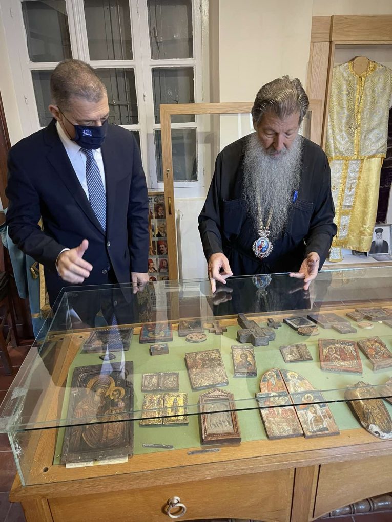 On Monday morning he attended the Holy Liturgy at the Theotokos Dormition Holy Temple at Agiasos and met with the Metropolitan of Mytilene, Eressos and Plomari Iakovos, along whom he visited the Ecclesiastical Museum of the Holy Pilgrimage of the Theotokos of Agiasos.