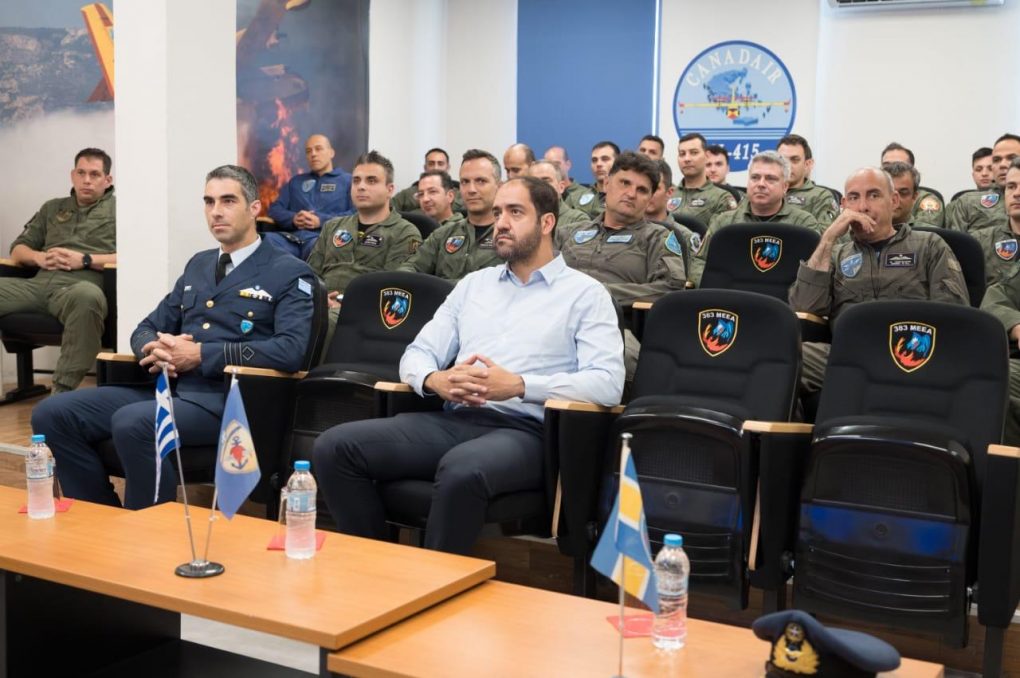 Mr. Kefalogiannis was briefed on the Squadron’s organisation, structure, mission and current activities, while he discussed with the personnel and was toured in the grounds where the Canadair CL415 Aircraft are based.