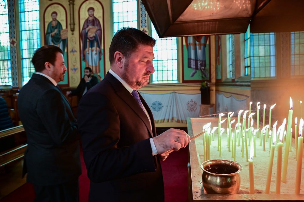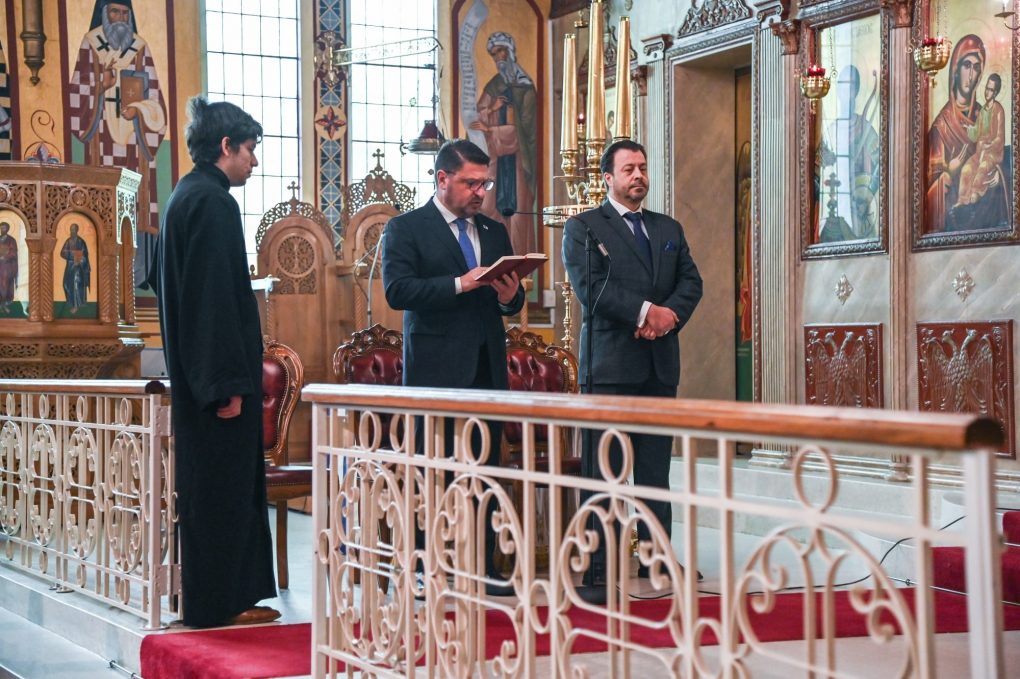 Before the meeting, the Deputy Minister of National Defence attended the Divine Liturgy and the Memorial Service in memory of the fallen at the Battle of Navarino at the Archdiocesan Church of St. Eustathios, officiated by His Grace, the Bishop of Sozopolis Mr. Kyriakos.