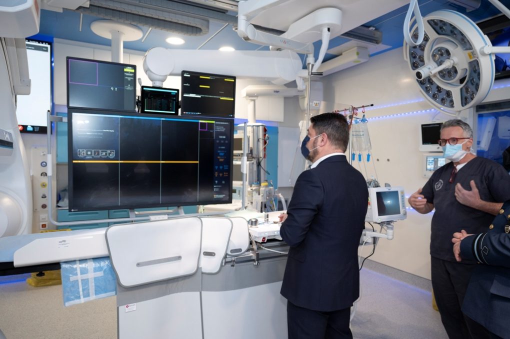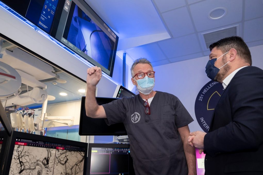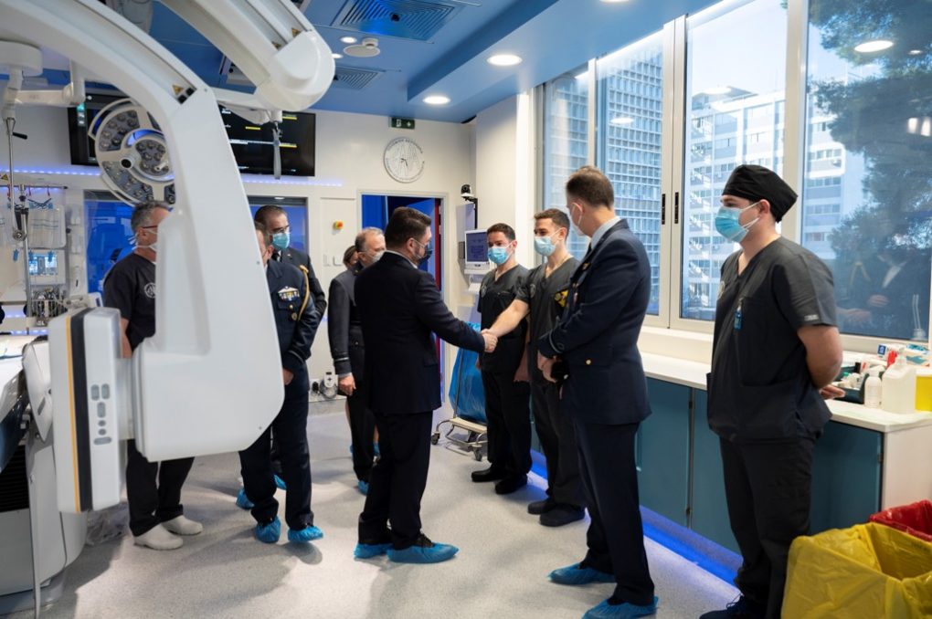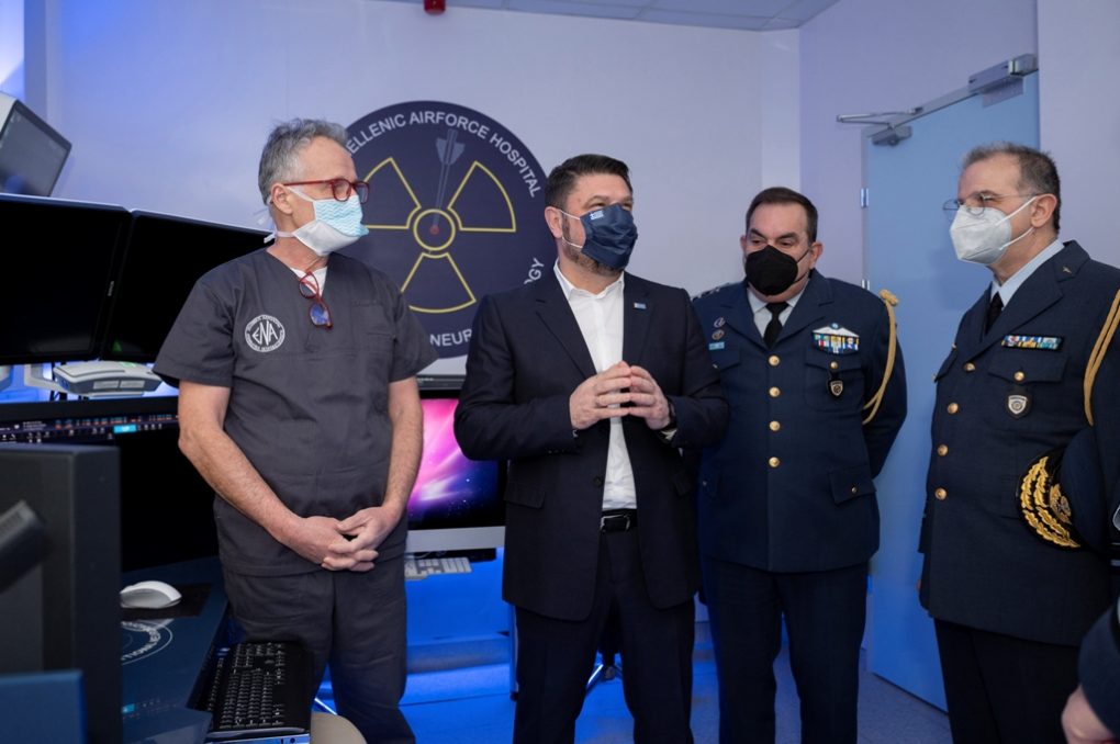 Mr. Chardalias also visited the Interventional Radiology – Neuroradiology Laboratory where he was briefed by its Director, Colonel (Med Corps) Konstantinos Lagios on its operation. He was further informed of the recent supply, installation, and operation of the state-of-the-art and innovative, biplane interventional neuroradiology angiography system, donated by Stavros Niarchos Foundation, the sophisticated software which increases both the efficiency and the success rates of CNS, peripheral vascular, and body surgical interventions.