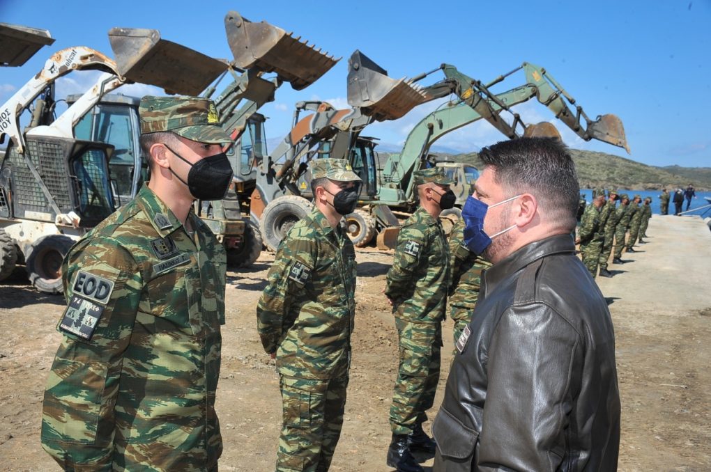 Furthermore, the Deputy Minister of National Defence inspected the project for the interconnection of the power grid of the Surveillance Outpost of “PANAGHIA” and the Church of Zoodochos Pigi on the small islet of Panaghia to the power grid of the Hellenic Electricity Distribution Network Operator (DEDDIE) via under-sea cable. This was a project which the political leadership of the Ministry of National Defence pledged to implement 6 months ago and which, in consultation and cooperation with the Hellenic National Defence General Staff, was completed a few days ago. The project required the effective cooperation of crews and assets of DEDDIE, the Municipalities of Chios and Inousses, and Army Engineer echelons. The activity was also attended by the Mayors of Chios, Mr. Stamatis Karmantzis, and Inouses, Mr. Georgios Daniil, as well as the Director of DEDDIE for Chios, Mr. Georgios Kalamakis. The Deputy Minister also discussed and exchanged wishes with personnel of the Engineer echelon who were involved in the grid maintenance works.