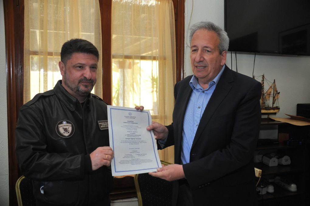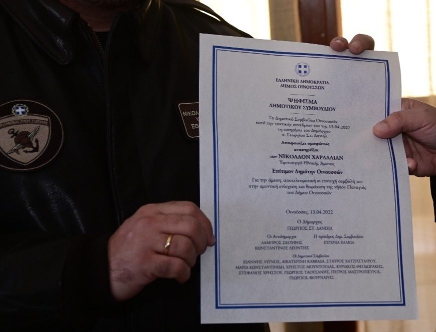 On the sidelines of his visit to Inousses, the Mayor Mr. Daniil proclaimed the Deputy Minister of National Defence Mr. Nikolaos Chardalias an Honorary Citizen of Inousses, following a unanimous decision of the Municipal Council, thus acknowledging his direct, effective, and successful contribution to the reinforcement of the defences of the small islet Panaghia. The relevant resolution, read by the Mayor of Inousses, reads as follows: