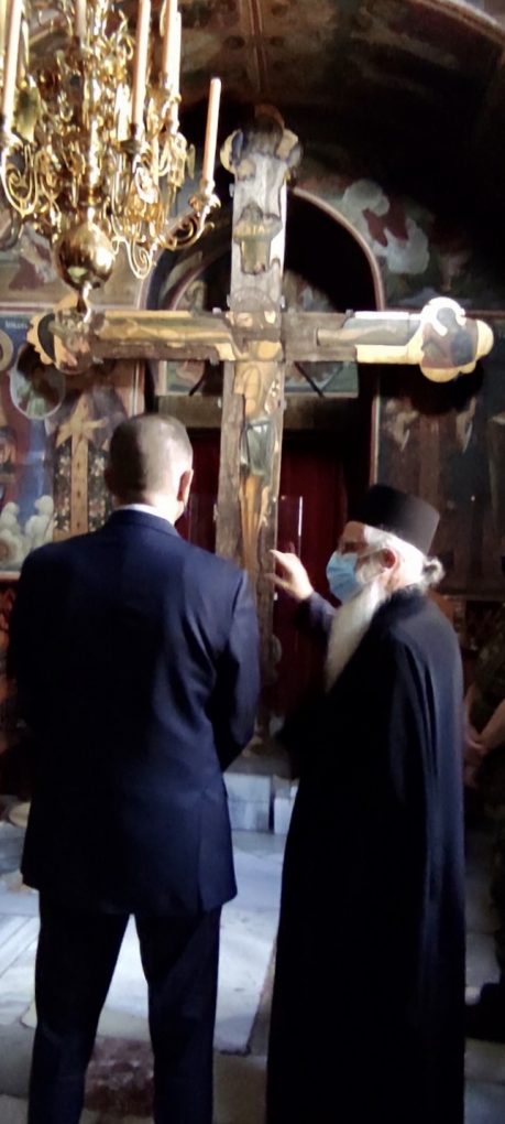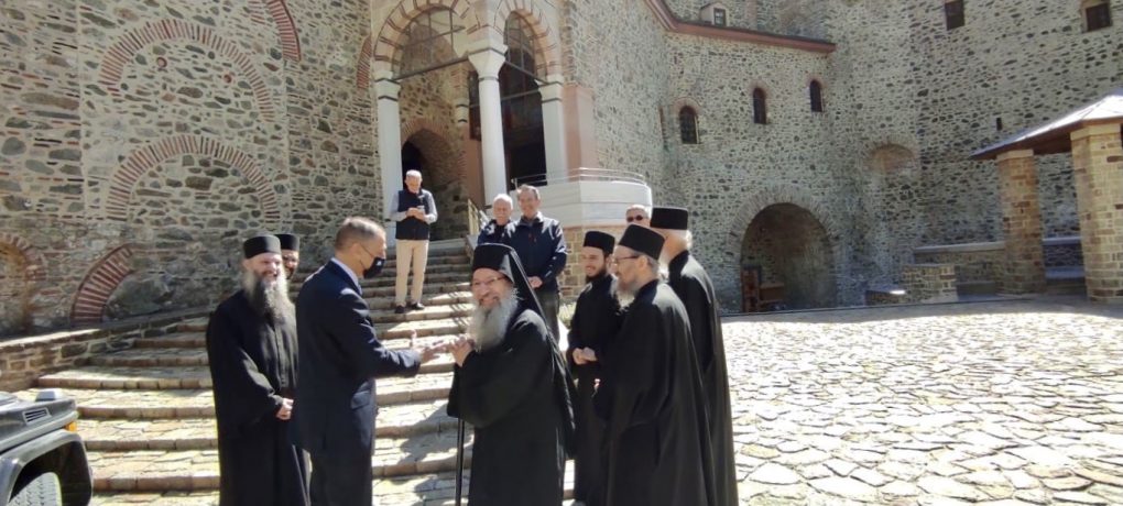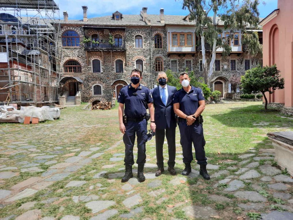 On Saturday 22 May 2021, the Deputy Minister of National Defence Alkiviadis Stefanis traveled to Mount Athos in the context of the close cooperation and support provided to the Cathedral of the Protaton by the Ministry of National Defence. The Protaton which is dedicated to the Dormition of Virgin Mary, and hosts the miracle-working Icon of Her “Axion Esti”, is the most ancient one of all Catholic ones in Mount Athos.