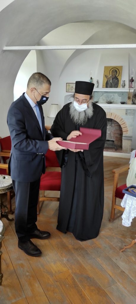 The Deputy Minister met with the Civil Governor Mr. Athanassios Martinos and Deputy Civil Governor Mr. Aristos Kasmiroglou, the Holy Religious Leader Monk Pavlos Lavriotis of Karyes, the Abbot of The Holy Monastery of Ivires, Mr. Nathanail, the Abbot of the Holy Patriarchal Monastery of Simonos Petras Mr. Elissaios and the President of the Greek Union of Shipowners Mr. Theodoros Veniamis.