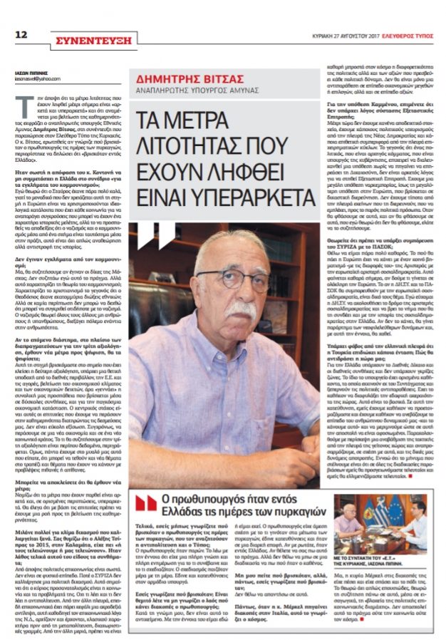 The Alternate Minister of National Defence Dimitris Vitsas in an interview for the ELEFTHEROS TYPOS newspaper and the journalist Iasonas Pipinis, which was issued on 27/08/2017, mentions the following: