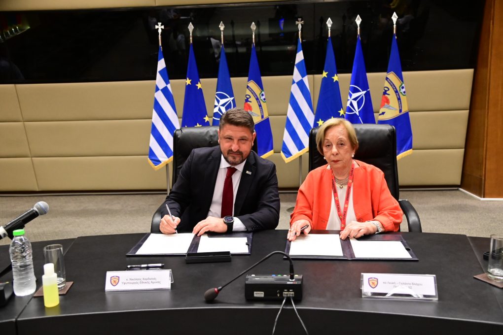 The Deputy Minister of National Defence Mr. Nikolaos Chardalias and the Chairperson of the Board of Directors of the Friends of Social Paediatrics and Medicine Association “Open Arms Hug”, Ms. Lefki-Yiolanda Vlachou, signed a Memorandum of Cooperation between the Ministry of National Defence and the Association, in a ceremony held in “IOANNIS KAPODISTRIAS” Hall of the Ministry of National Defence, on Monday 3 October 2022.