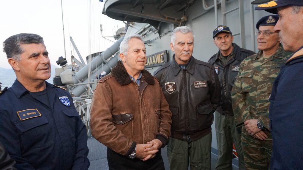 The Minister of National Defence was accompanied by the Chief of the Hellenic National Defence General Staff General Christos Christodoulou, the Chief of the Hellenic Army General Staff Lieutenant General Georgios Kambas, the Chief of the Hellenic Navy General Staff Vice Admiral Nikolaos Tsounis, the Chief of the Hellenic Air Force General Staff Lieutenant General Georgios Blioumis and the Fleet Commander in Chief Vice Admiral Stylianos Petrakis.