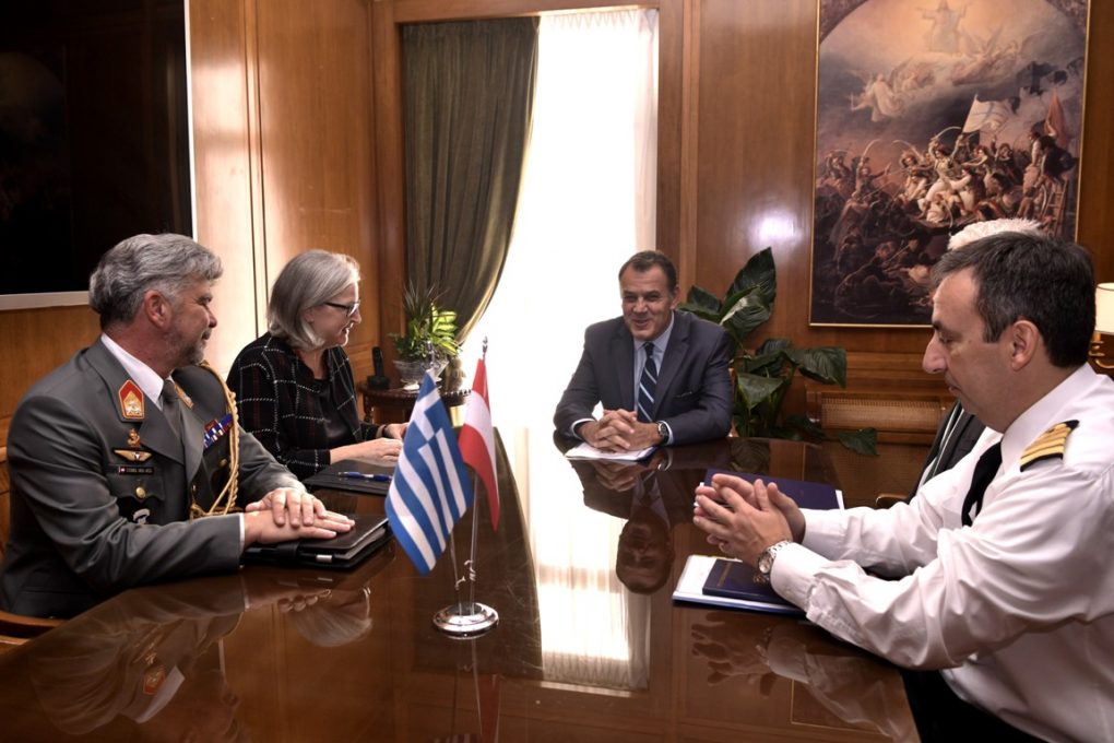 The Minister of National Defence Mr. Nikolaos Panagiotopoulos met today with the Ambassador of Austria Mrs. Hermine Poppeller, with whom they discussed matters pertaining to the enhancement of the bilateral cooperation in the field of defence.
