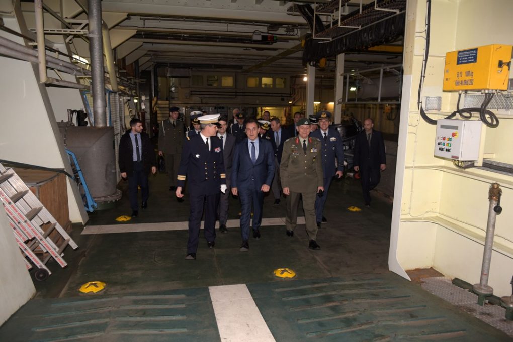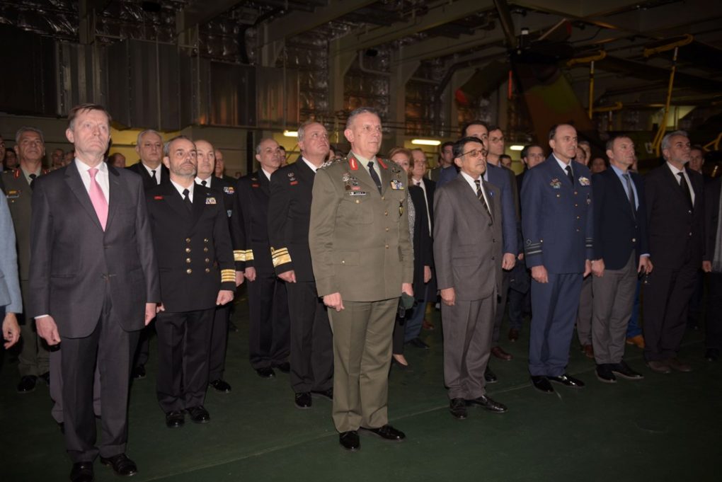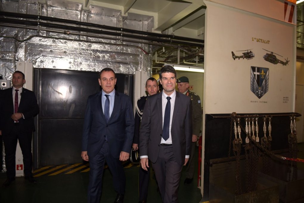 On Monday, 27 January 2020, the Minister of National Defence, Mr. Nikolaos Panagiotopoulos, accompanied by the Chief of the Hellenic National Defence General Staff, General Konstantinos Floros, the Chief of the Hellenic Navy General Staff, Vice Admiral Stylianos Petrakis HN, the Chief of the Hellenic Air Force General Staff, Lieutenant General Georgios Blioumis HAF and the General Manager of the General Directorate of Defence Investments and Armaments, Lieutenant General Theodoros Lagios HAF (ret.), visited the ‘DIXMUDE’ Amphibious Assault Ship (Helicopter Carrier) of the French Navy, at Piraeus Port. The French ambassador to Greece, Mr. Patrick Maisonnave welcomed the Minister of National Defence on board the ‘Dixmude’ helicopter carrier.