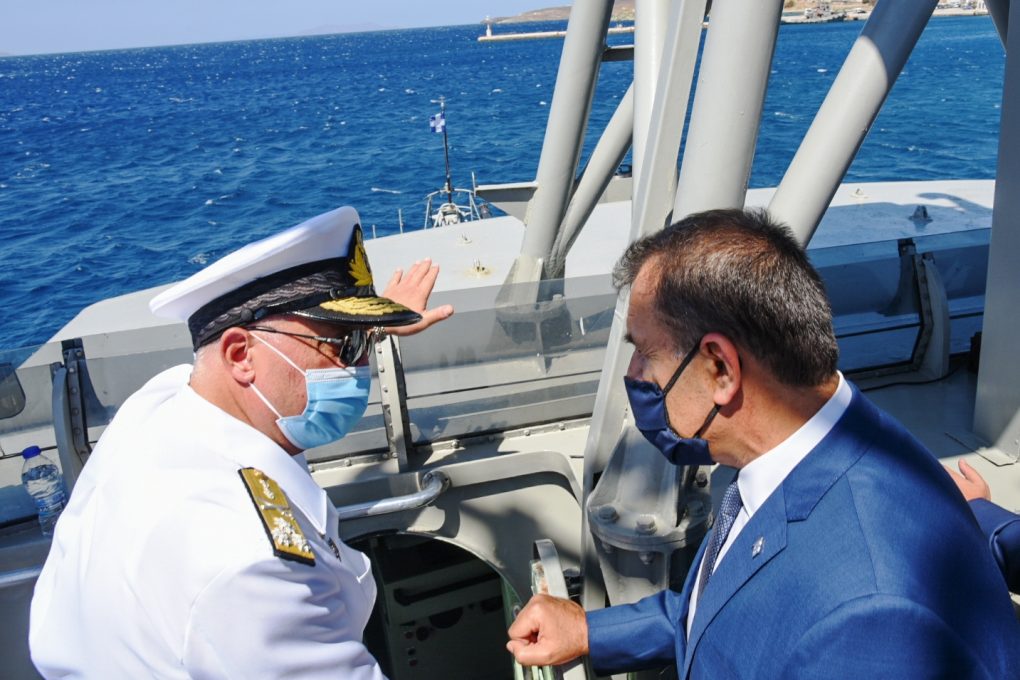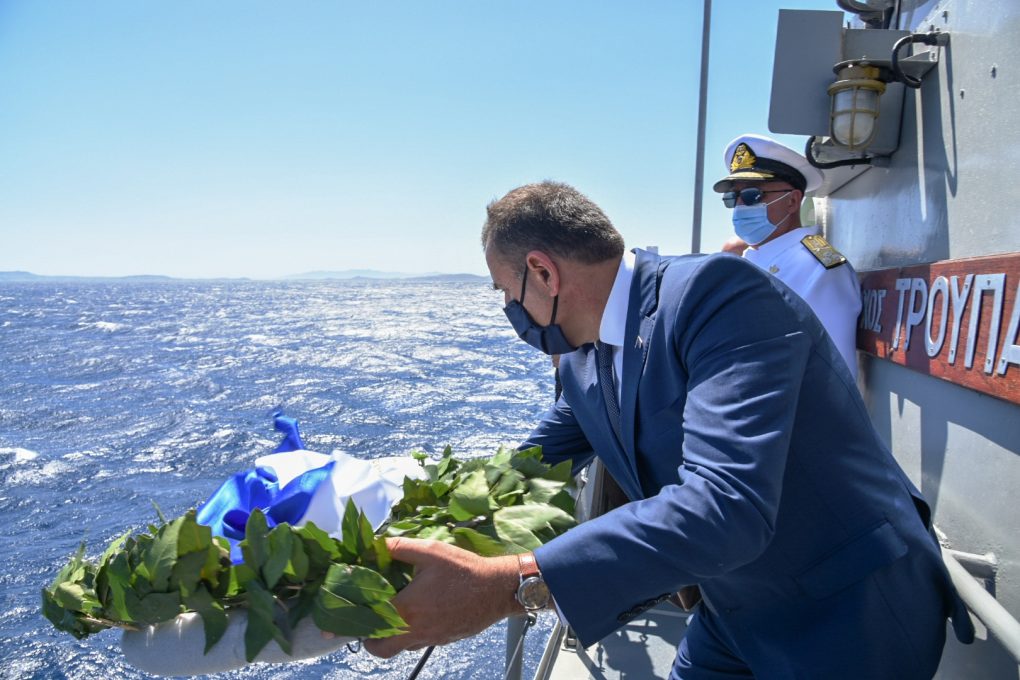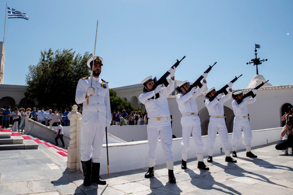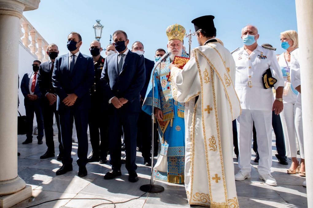 Today Saturday 15 August 2020, the Minister of National Defence Mr. Nikolaos Panagiotopoulos attended the celebration events in honour of the Dormition of Virgin Mary and the torpedoing of the Greek Cruiser “ELLI” at the island of Tinos.