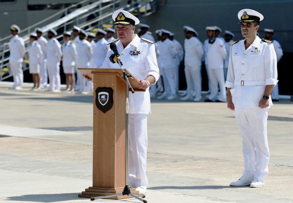 Addressing now the Captain, the officers and the crew, I look into your eyes and I remind you that you belong in our selected and unique military personnel, this force multiplier, that through its determination and effectiveness make our Armed Forces well-trained and capable of fully protecting the first and basic principle of National Security for the Country. Perform your duty in the extreme, across the seas, where you will be called to operate, being ready to sail with unrestrained momentum when and wherever needed, in accordance with the values and traditions of the Navy and of our Armed Forces!