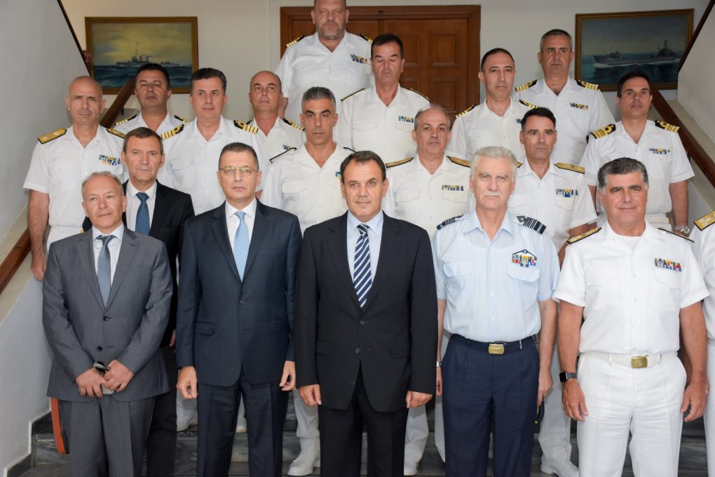The Minister of National Defence, Mr. Nikolaos Panagiotopoulos, accompanied by the Chief of Hellenic National Defence General Staff, General (HAF) Christos Christodoulou, and the Chief of Hellenic Navy General Staff, Vice Admiral Nikolaos Tsounis HN, visited the Fleet Headquarters in Salamis Naval Base, where he was welcomed by the Commander in Chief of the Hellenic Fleet, Vice Admiral Stylianos Petrakis HN.