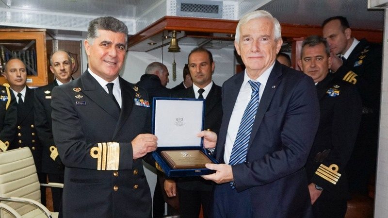 Then, the Minister of National Defence visited the “AEGEON” Frigate, where he awarded Panos and Athanasios Laskaridis brothers for the grant of four new auxiliary diesel generators for the vessel.