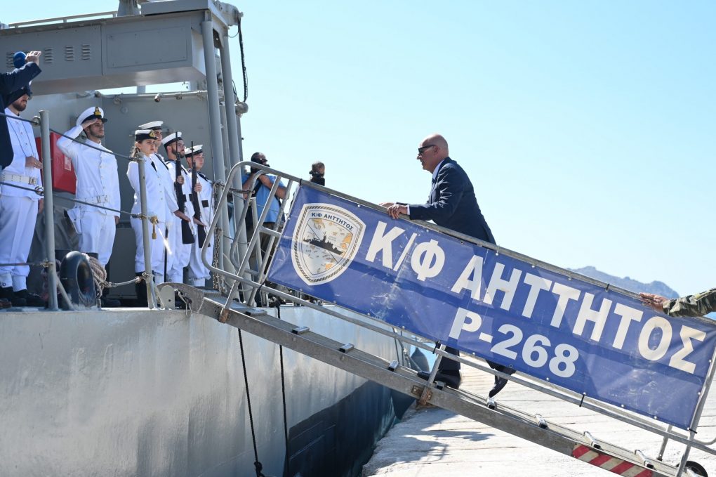 After the ceremony, Mr. Dendias boarded the Gunboat “AITITOS” and proceeded to the location where the Destroyer sank along with its heroic crew on 26 September 1943, where he laid a wreath of laurels. The visit to Leros was concluded with a visit to the Leros National Guard Club.