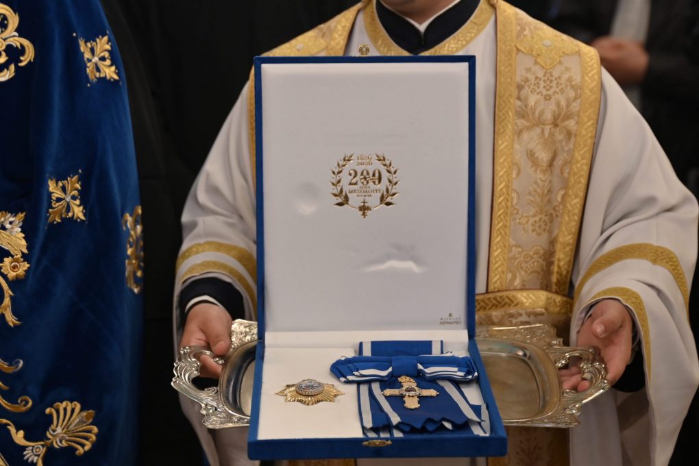 After the Doxology, the Metropolitan of Aetolia – Acarnania presented the Minister of National Defence with the Golden Cross with Commemorative Star of the 200 years since the heroic Exodus of Messolonghi, as recognition for his work.
