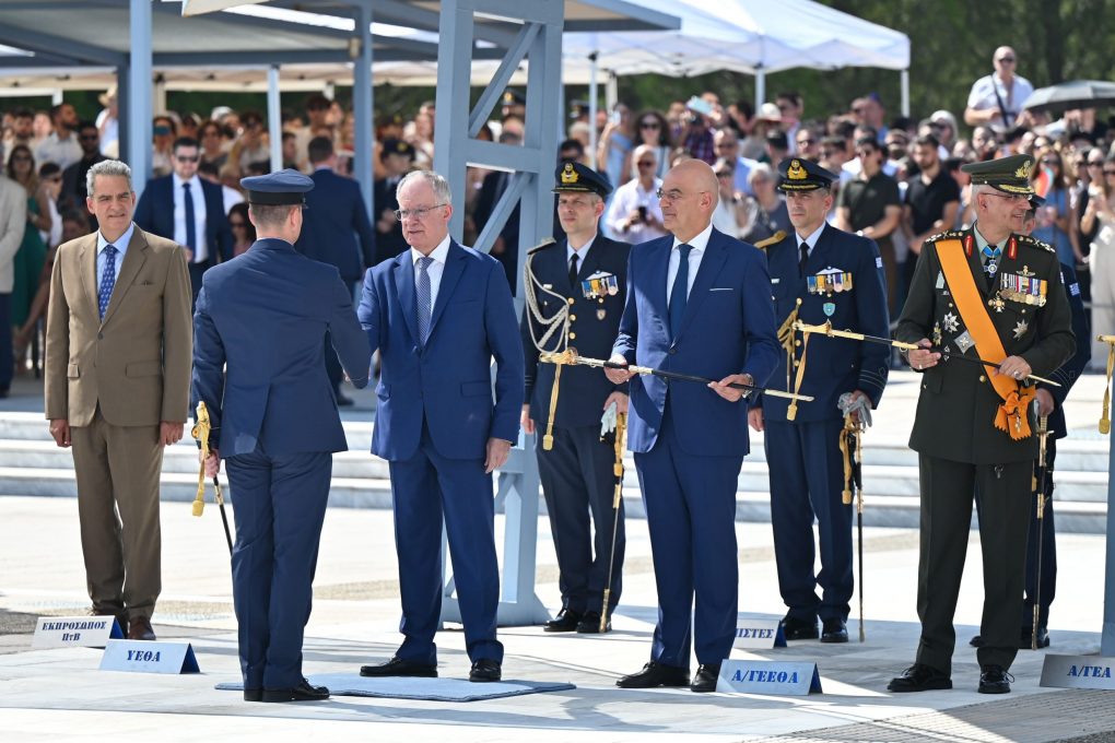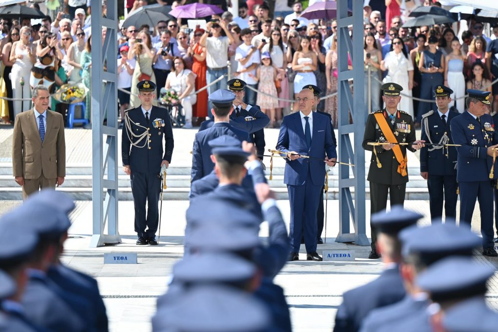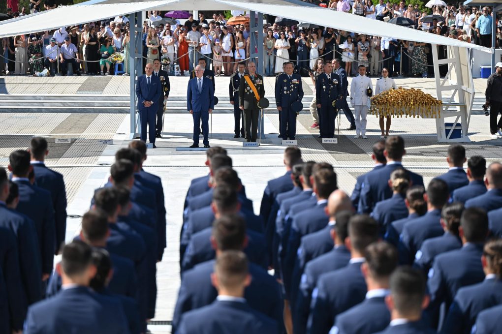 On Tuesday, 8 July 2025, the Minister of National Defence Nikos Dendias, representing the Prime Minister, attended the oath-taking ceremony of the new Second Lieutenants, Class 2025, held at the Hellenic Air Force Academy in Tatoi, before His Excellency, the President of the Hellenic Republic Konstantinos Tasoulas, who presented the Officer’s sword to the new Second Lieutenants of the Hellenic Air Force. The doxology was officiated by the Metropolitan of Ilion, Acharnes, and Petroupoli Mr. Athinagoras.