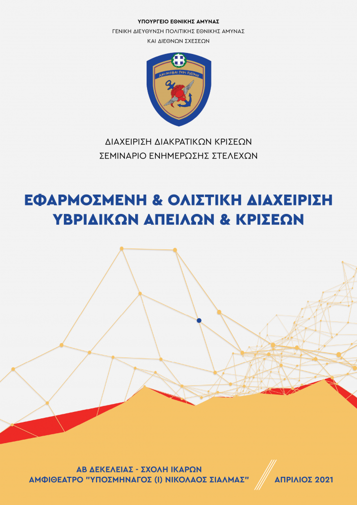 Tomorrow, Thursday 1 April 2021, the Minister of National Defence Mr. Nikolaos Panagiotopoulos will inaugurate the beginning of the works of the seminar entitled “APPLIED AND HOLISTIC MANAGEMENT OF HYBRID THREATS AND CRISES”, organized by the General Directorate of National Defence Policy and International Relations of the Ministry of National Defence, at the “First Lieutenant (AF) Nikolaos Sialmas” Amphitheatre, at the Hellenic Air Force Academy.