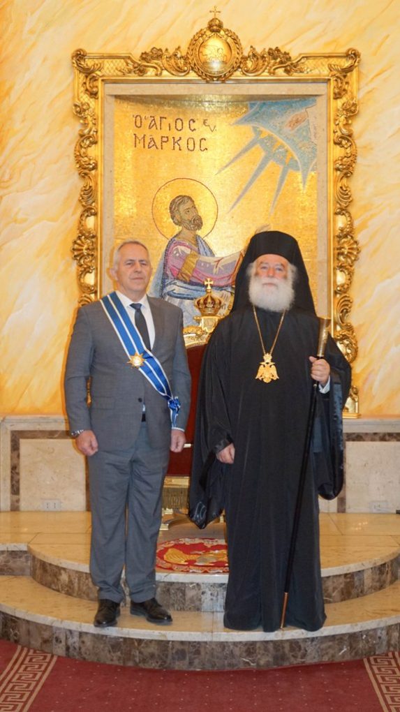 The Minister of National Defence Evangelos Apostolakis went to Alexandria, on Friday 8 March 2019, where he met with His Divine Beatitude the Pope and Patriarch of Alexandria and All Africa Theodoros II. His Beatitude honoured the Minister of National Defence with the Grand Cross of Mark the Evangelist.