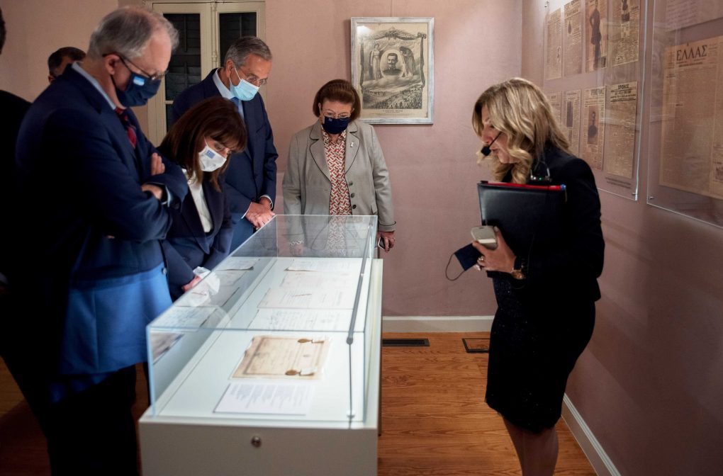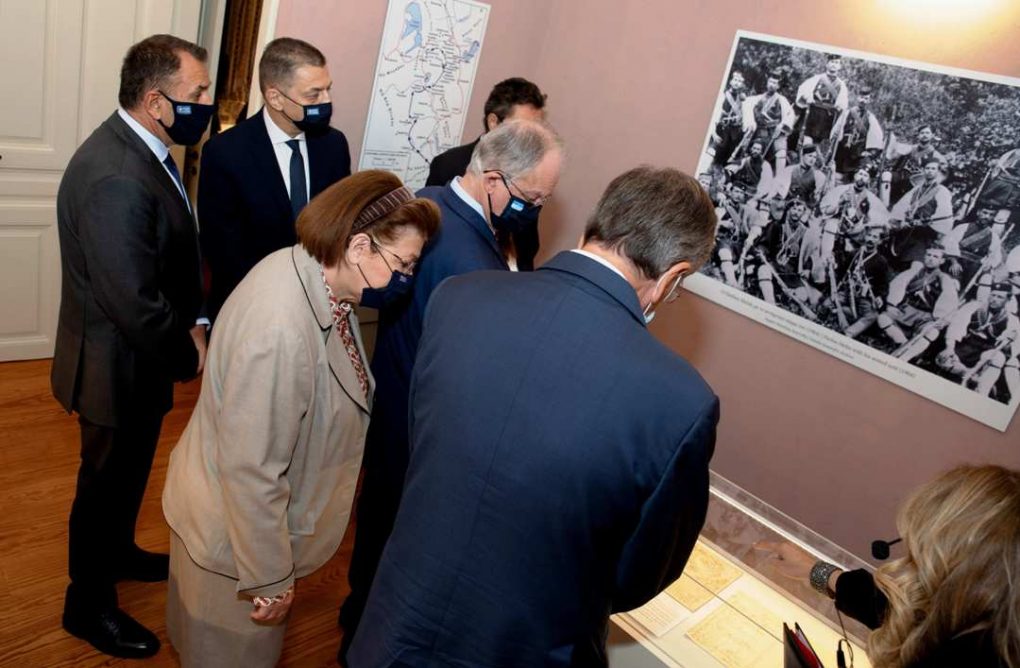The President of the Republic, the Speaker of the Hellenic Parliament, the former Prime Minister, Ministers and Members of the Parliament had the chance to look at Pavlos Melas’ personal effects, an exact replica of his uniform, the Hero’s hologram writing the letter to Evelpides and records of photographs, publications and letters after his death.