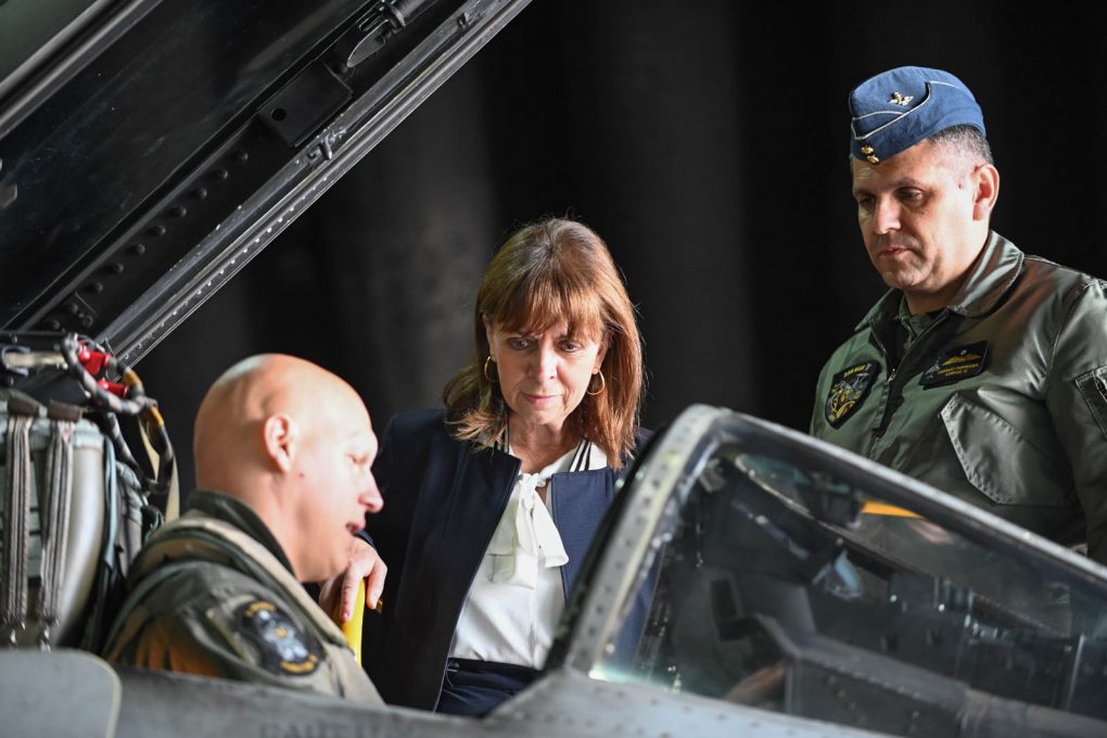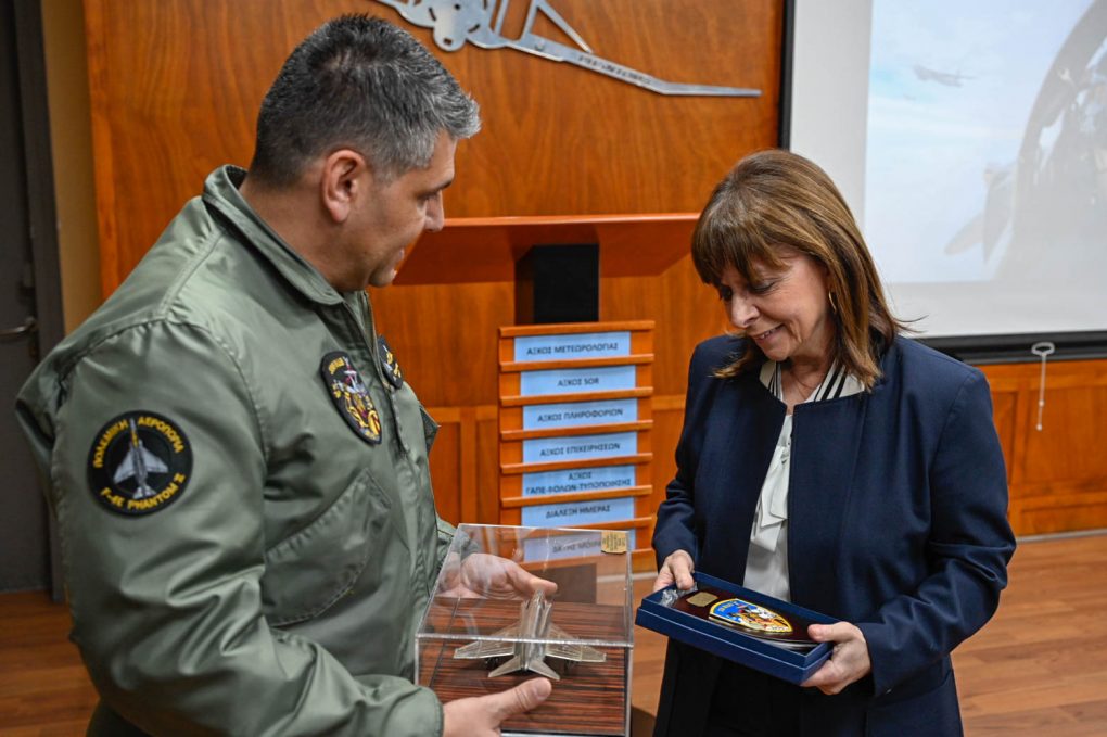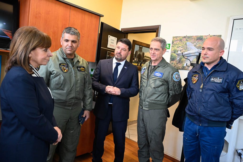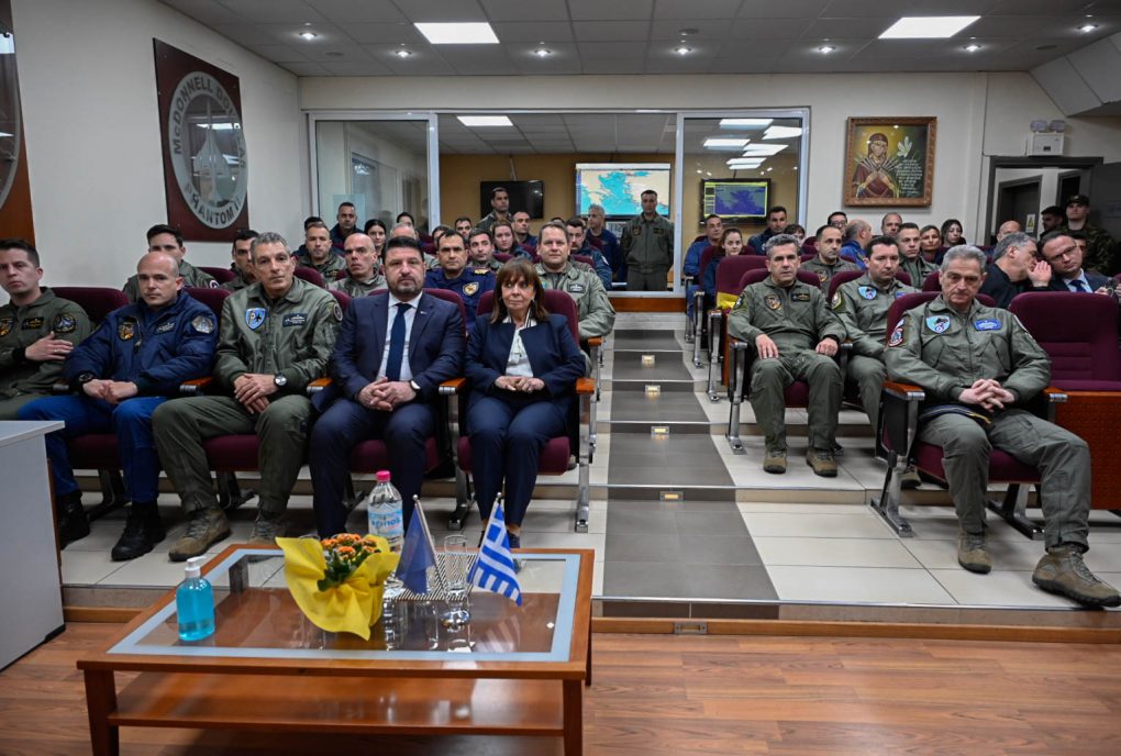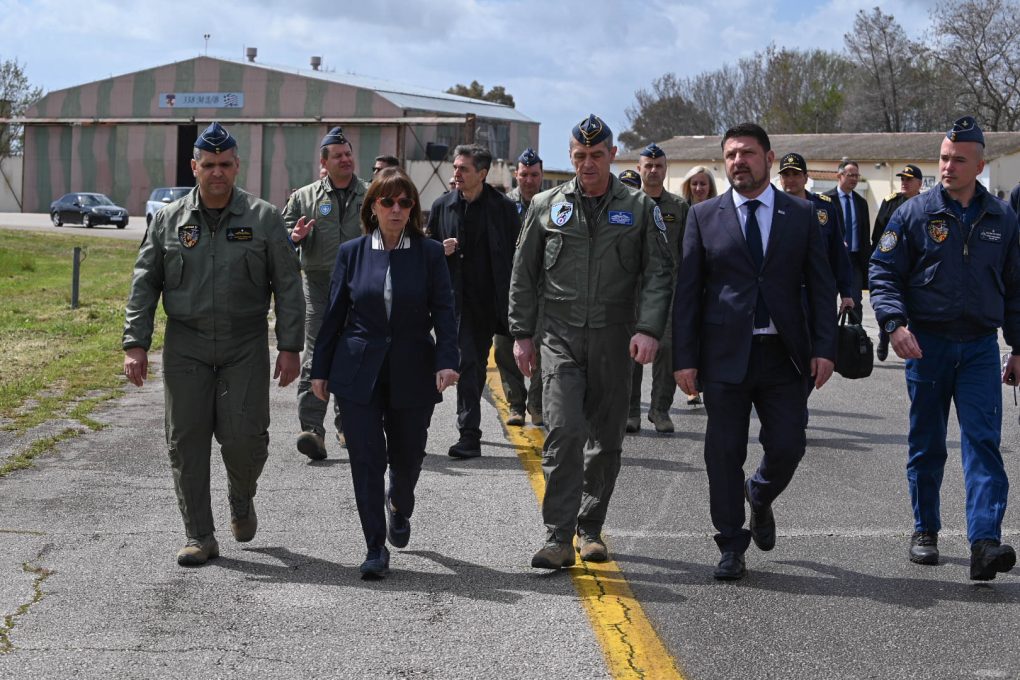 On Wednesday, 15 March 2023, Her Excellency, the President of the Hellenic Republic, Ms. Katerina Sakellaropoulou, visited the headquarters of the 338th Squadron at Andravida Air Base, where she was welcomed by the Deputy Minister of National Defence, Mr. Nikolaos Chardalias, and the Chief of Hellenic Tactical Air Force, Lieutenant General (HAF) Georgios Fasoulas.