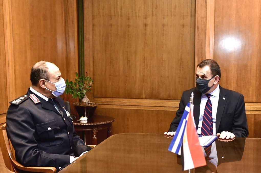 Today 30 March 2021, the Minister of National Defence Mr. Nikolaos Panagiotopoulos met with the Chief of the Air Force of Egypt, Lieutenant General Mohammed Abbas Helmy Hashem, who is visiting our country following an invitation extended by HAFGS Chief Lieutenant General Georgios Blioumis.