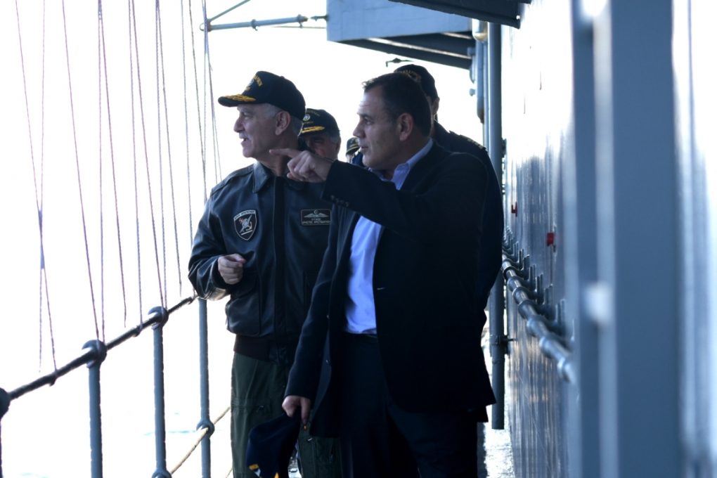 Then, the Minister of National Defence visited by helicopter the “NAVARINON” Frigate, acting as a guard-ship in the Northern Aegean Sea, where he exchanged wishes with the crew.