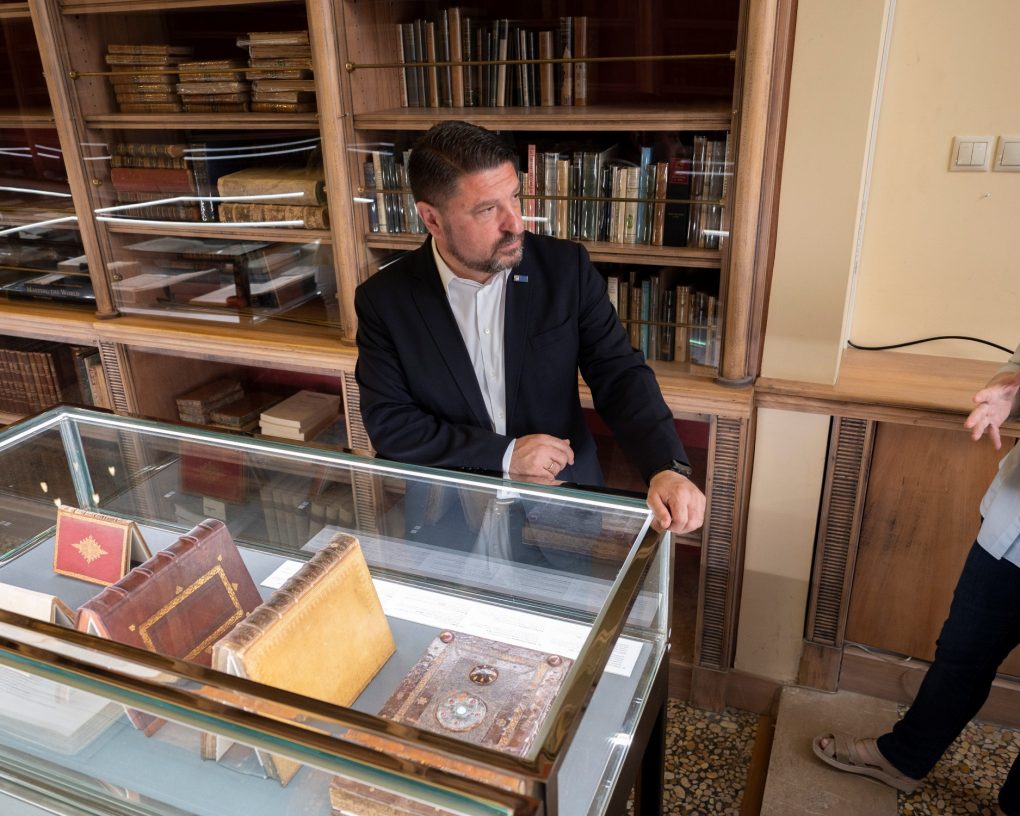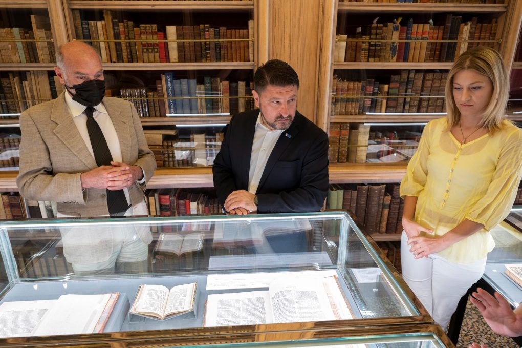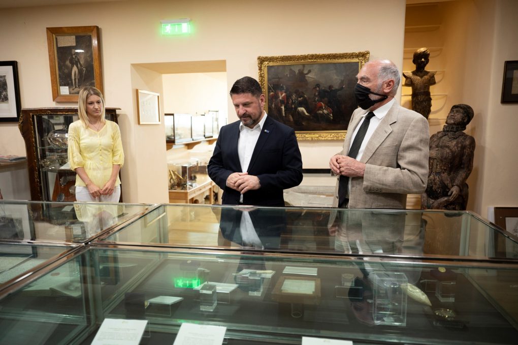 Subsequently, the Deputy Minister of National Defence visited the Aikaterini Laskaridis Foundation, where its Director, the Honorary Commander in Chief of the Hellenic Fleet Vice Admiral (retired) Konstantinos Mazarakis – Ainian briefed him on the exceptionally important work accomplished by the Organisation, at the Greek and international level, aiming to showcase the Greek culture, particularly the Greek literature, as well as the historical and maritime research and art. Furthermore, he was given a tour of the premises of the Foundation’s Historical Library, which contains book collections and records of major figures of literature, arts and sciences, as well as the premises of the Nelson Maritime Collection, which includes personal items, tens of letters and exhibits connected to the English Admiral Horatio Nelson, which constitutes the largest collection of its kind, out of the United Kingdom.