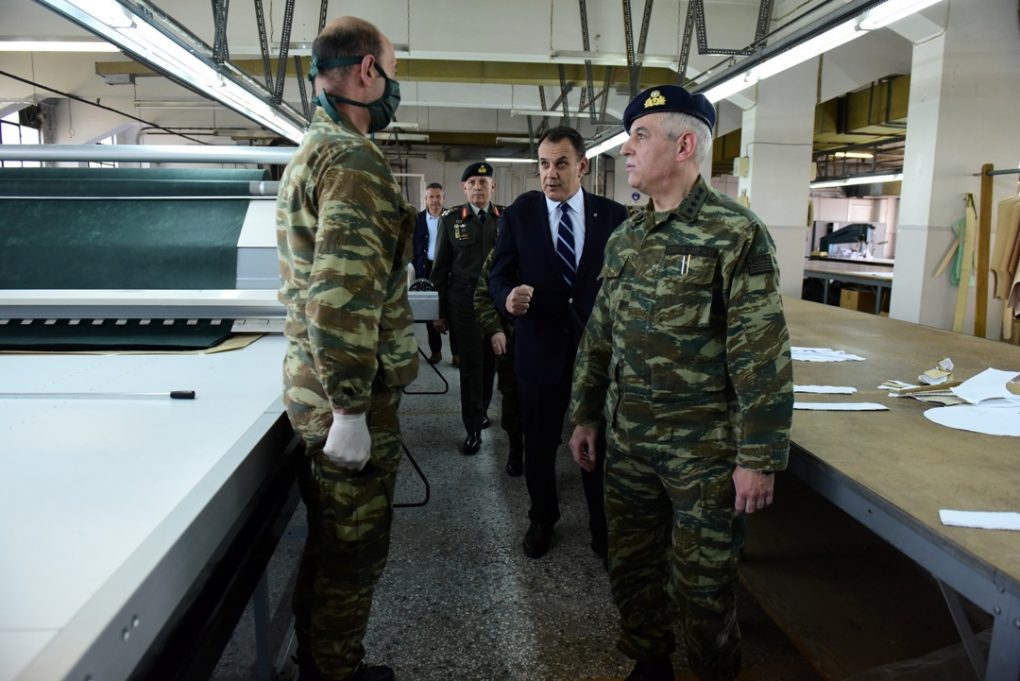 Ο Υπουργός Εθνικής Αμύνης κ. Νικόλαος Παναγιωτόπουλος, συνοδευόμενος από τον Υφυπουργό Εθνικής Αμύνης κ. Αλκιβιάδη Στεφανή, τον Αρχηγό ΓΕΕΘΑ Στρατηγό Κωνσταντίνο Φλώρο και τον Αρχηγό ΓΕΣ Αντιστράτηγο Χαράλαμπο Λαλούση, πραγματοποίησε σήμερα, Μεγάλη Δευτέρα 13 Απριλίου 2020, διαδοχικές επισκέψεις στις εγκαταστάσεις του 700 Στρατιωτικού Εργοστασίου στον Πειραιά και της 441 Αποθήκης Βάσεως Υγειονομικού Υλικού στην Αθήνα.