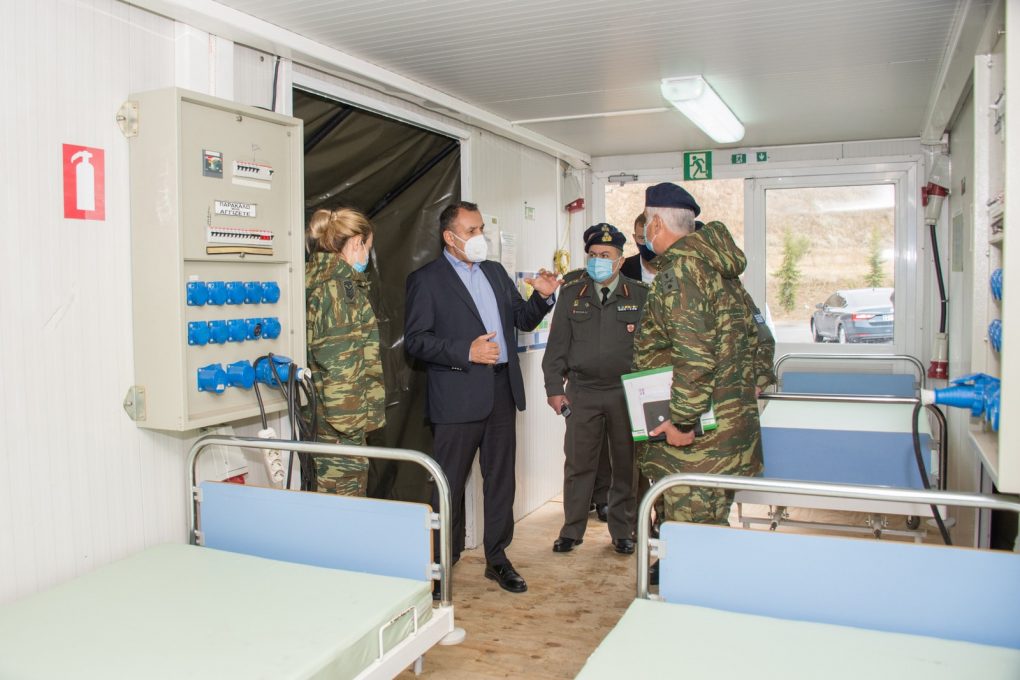 Ο Υπουργός Εθνικής Αμύνης, επίσης, επισκέφθηκε την 300 Κινητή Υγειονομική Μονάδα Αντιμετωπίσεως Εκτάκτων Αναγκών (ΚΥΜΕΑ) που έχει αναπτυχθεί στο προαύλιο του 424 ΓΝΣΕ.