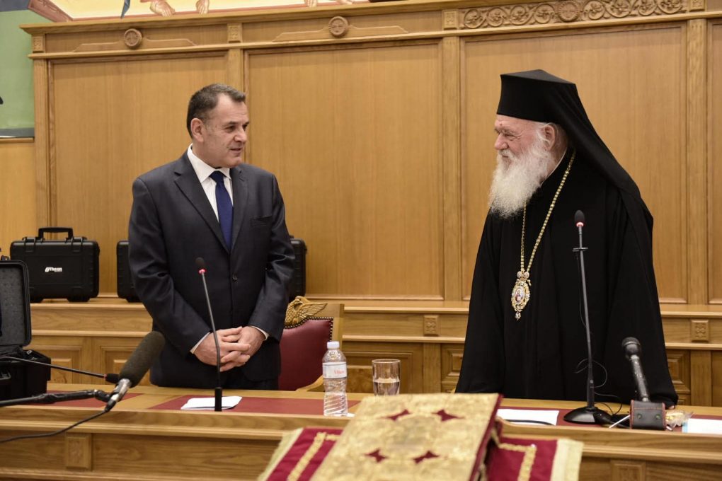 «Προσήλθα σήμερα στο κτήριο της Διαρκούς Ιεράς Συνόδου της Εκκλησίας της Ελλάδος, ενώπιον του Μακαριωτάτου και των Αρχιερέων προκειμένου να αποδεχθώ για λογαριασμό των Ενόπλων Δυνάμεων της χώρας, μια δωρεά σε υλικό εξοπλισμό για τις δυνάμεις που φυλάττουν τα σύνορα στον Έβρο.