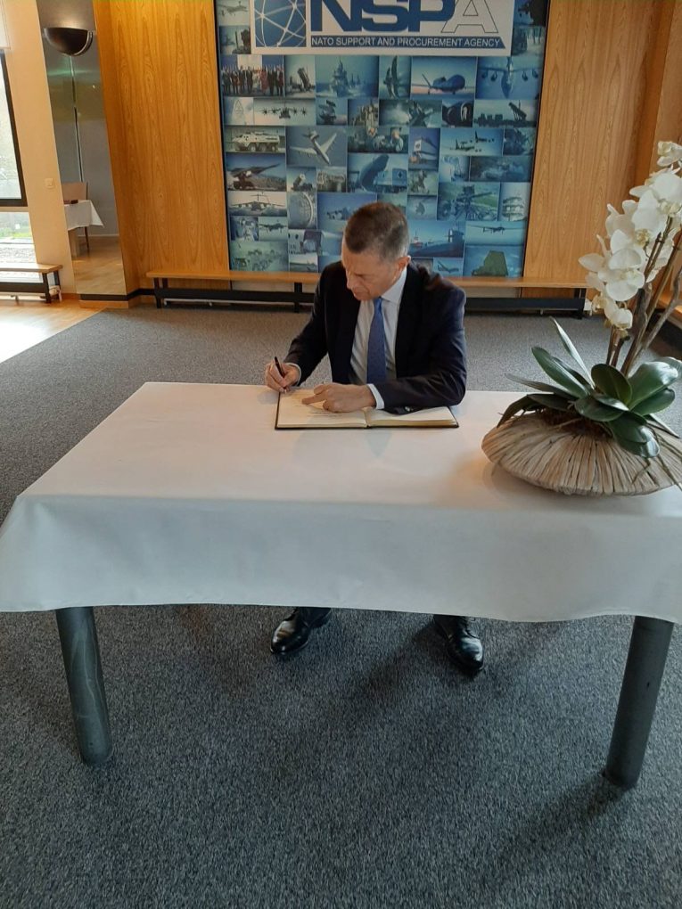 Ο Υφυπουργός Εθνικής Άμυνας κατά την επίσκεψή του συνοδευόταν από τον Έλληνα Εκπρόσωπο του Εποπτικού Συμβουλίου της NSPA, Ταξίαρχο Ιωάννη Μαυρογένη.