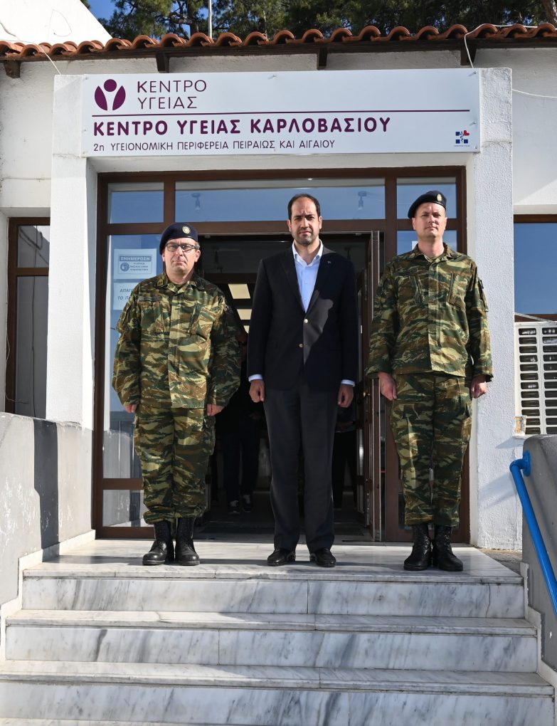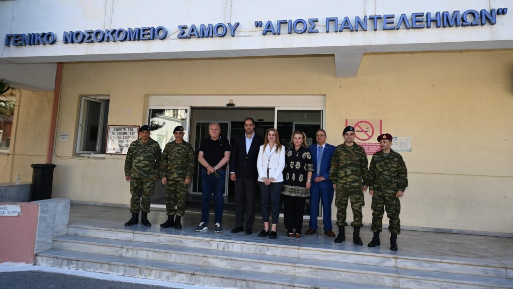 Στη συνέχεια, μετέβη στο Γενικό Νοσοκομείο Σάμου, όπου συναντήθηκε με τους Στρατιωτικούς Ιατρούς, Παθολόγο και Καρδιολόγο, που διατίθενται από το Υπουργείο Εθνικής Άμυνας για τις ανάγκες του νοσοκομείου, τους οποίους ευχαρίστησε και συνεχάρη για το σημαντικό έργο που επιτελούν.