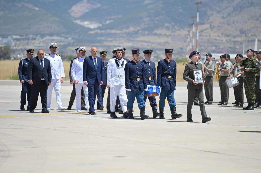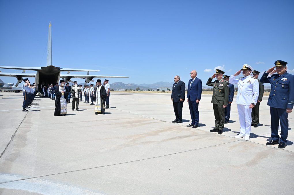 Ο Υπουργός Εθνικής Άμυνας Νίκος Δένδιας παρέστη σήμερα, Παρασκευή 31 Μαΐου 2024, συνοδευόμενος από τον Αρχηγό ΓΕΣ Αντιστράτηγο Γεώργιο Κωστίδη, ως εκπροσώπου και του Αρχηγού ΓΕΕΘΑ Στρατηγού Δημήτριου Χούπη, τον Αρχηγό ΓΕΝ Αντιναύαρχο Δημήτριο-Ελευθέριο Κατάρα ΠΝ και τον Αρχηγό ΓΕΑ Αντιπτέραρχο (Ι) Δημοσθένη Γρηγοριάδη, στην τελετή επαναπατρισμού των λειψάνων εννέα Ελλήνων Οπλιτών από την Κυπριακή Δημοκρατία, η οποία πραγματοποιήθηκε στην Αεροπορική Βάση Ελευσίνας.