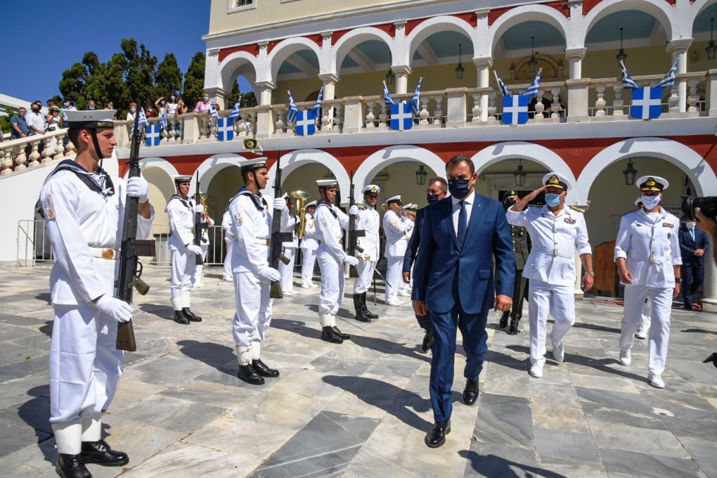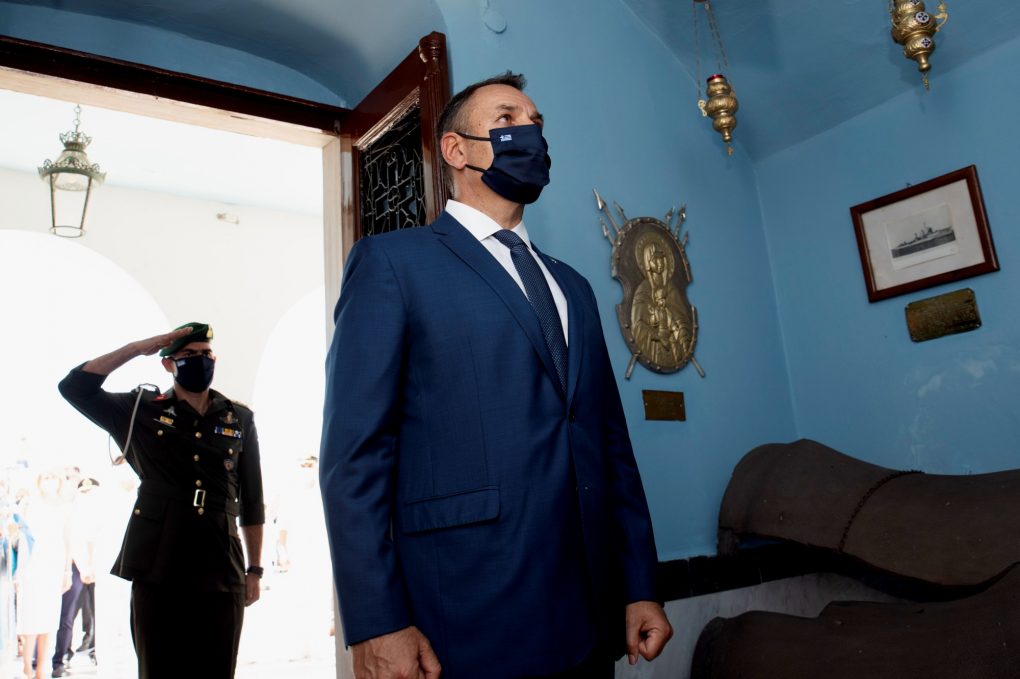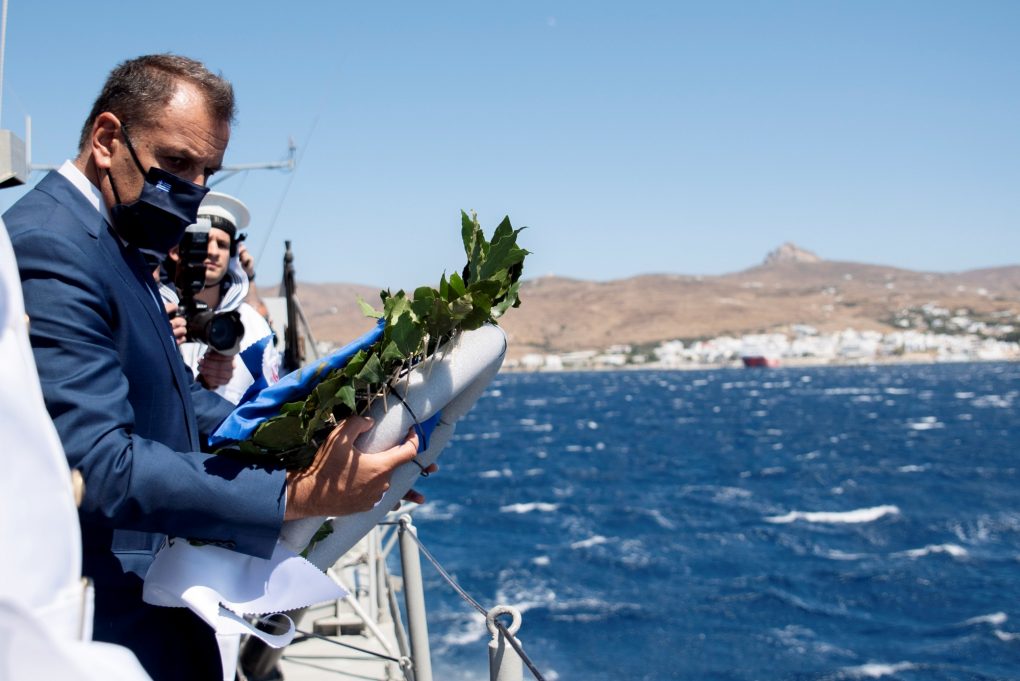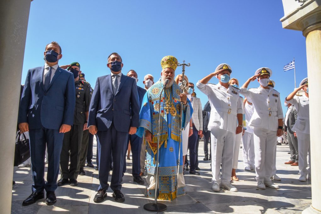 Ο Υπουργός Εθνικής Αμύνης κ. Νικόλαος Παναγιωτόπουλος παρέστη σήμερα Σάββατο 15 Αυγούστου 2020 στις εκδηλώσεις για να τιμηθεί η Κοίμηση της Θεοτόκου και η 80η επέτειος από τον τορπιλισμό του ευδρόμου «ΕΛΛΗ» στην Τήνο.