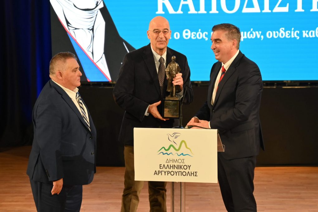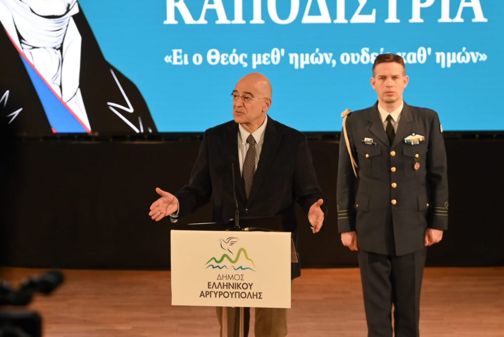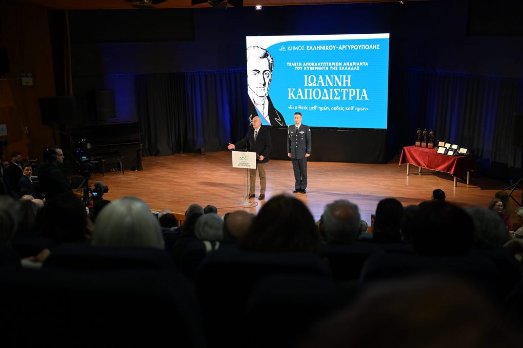 Ο Υπουργός Εθνικής Άμυνας, Νίκος Δένδιας, εκπροσώπησε σήμερα, Κυριακή 1 Φεβρουαρίου 2026, τον Πρόεδρο της Κυβέρνησης, στην επίσημη τελετή αποκαλυπτηρίων του ανδριάντα του Πρώτου Κυβερνήτη της Ελλάδας Ιωάννη Καποδίστρια και της μετονομασίας της Πλατείας Δημαρχείου σε «Πλατεία Κυβερνήτη» Ιωάννη Καποδίστρια, η οποία πραγματοποιήθηκε στο Πολιτιστικό-Συνεδριακό Κέντρο «Μίκης Θεοδωράκης» του Δήμου Ελληνικού Αργυρούπολης.