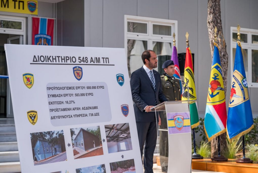 «Έχω τη μεγάλη τιμή να βρίσκομαι σήμερα εδώ, στο Ρέθυμνο, για τα εγκαίνια του νέου Διοικητηρίου του 548 Αερομεταφερόμενου Τάγματος Πεζικού. Το έργο που σήμερα εγκαινιάζουμε, αποτελεί ένα ακόμα βήμα στην πορεία της βελτίωσης και του εκσυγχρονισμού των υποδομών των Ενόπλων μας Δυνάμεων. Αποτελεί ένα ακόμα δείγμα του σχεδιασμού της στρατιωτικής και πολιτικής ηγεσίας και της υλοποίησης των δεσμεύσεων, με απώτερο σκοπό την αναβάθμιση των στρατιωτικών μας δυνατοτήτων.